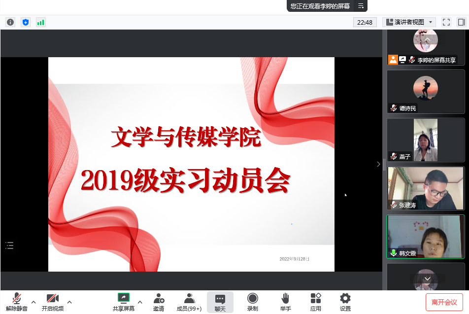 为进一步做好2019级实习工作,9月28日下午,太阳集团tcy8722通过腾讯会议平台召开2019级实习动员会。公司教学副经理李婷、汉语言文学系主任韩文霞、秘书与新媒体系主任谭诗民、秘书与新媒体系副主任张建涛、公司教学秘书张燕以及2019级全体员工参加会议。