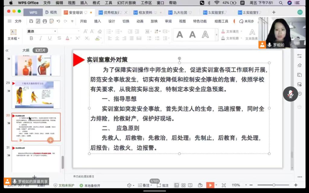 导航痕迹 首页 > 教学科研 > 教学活动 > 正文 专业建设 教学团队 教研教改 教学活动 科学研究 国际交流 太阳集团tcy8722开展实验室安全知识线上培训会 来源:太阳集团tcy8722 发布日期:2022年11月12日 阅读次数: 为进一步加强实验室安全管理,强化公司师生安全意识,太阳集团tcy8722于11月11日下午七点通过腾讯会议开展实验室安全知识培训。本次线上会议由网络与新媒体专业教师罗相如主持,太阳集团tcy87222022年新进老师及2022级全体员工参会。 罗相如首先通过近几年高校发生的实验室安全事故案例提醒师生“实验室中的任何一个隐患,任何一个小小的疏忽,都有可能酿成大的事故,要时刻注意实验室的安全问题”。随后,她以视频讲解和随机提问相结合的方式向大家详细介绍了公司各实训室的设置、功能和使用须知,特别强调了电火安全、禁止事项等,提示各位师生实验室中可能存在的安全隐患,并示范了灭火器的使用方法,告诉大家如何应对窗帘着火、电脑着火等意外事故的发生。 通过此次实验室安全线上培训会,公司师生进一步增强了对实验室安全的责任意识和重视程度,掌握了在实验室事故发生时的应对和处置技能。 撰稿/图片提供/罗相如 审核/李婷 发布/崔瑜