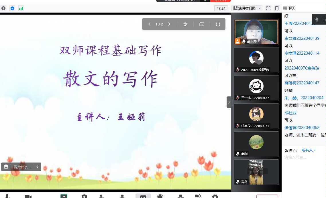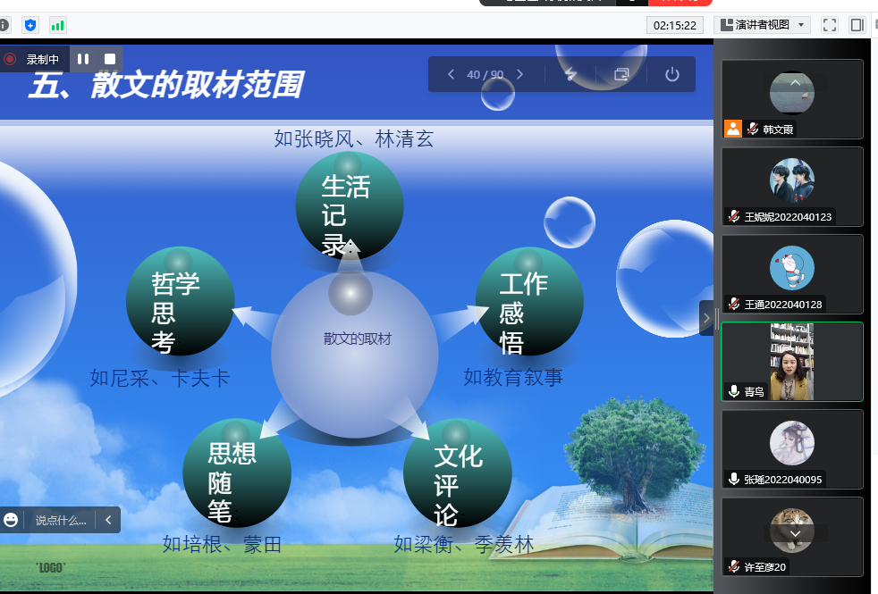 12月7日下午,作家王娅莉应太阳集团tcy8722邀请,通过腾讯会议与基础写作课校内教师韩文霞、曹刚一同为汉语言文学专业2022级员工讲授“散文创作”。