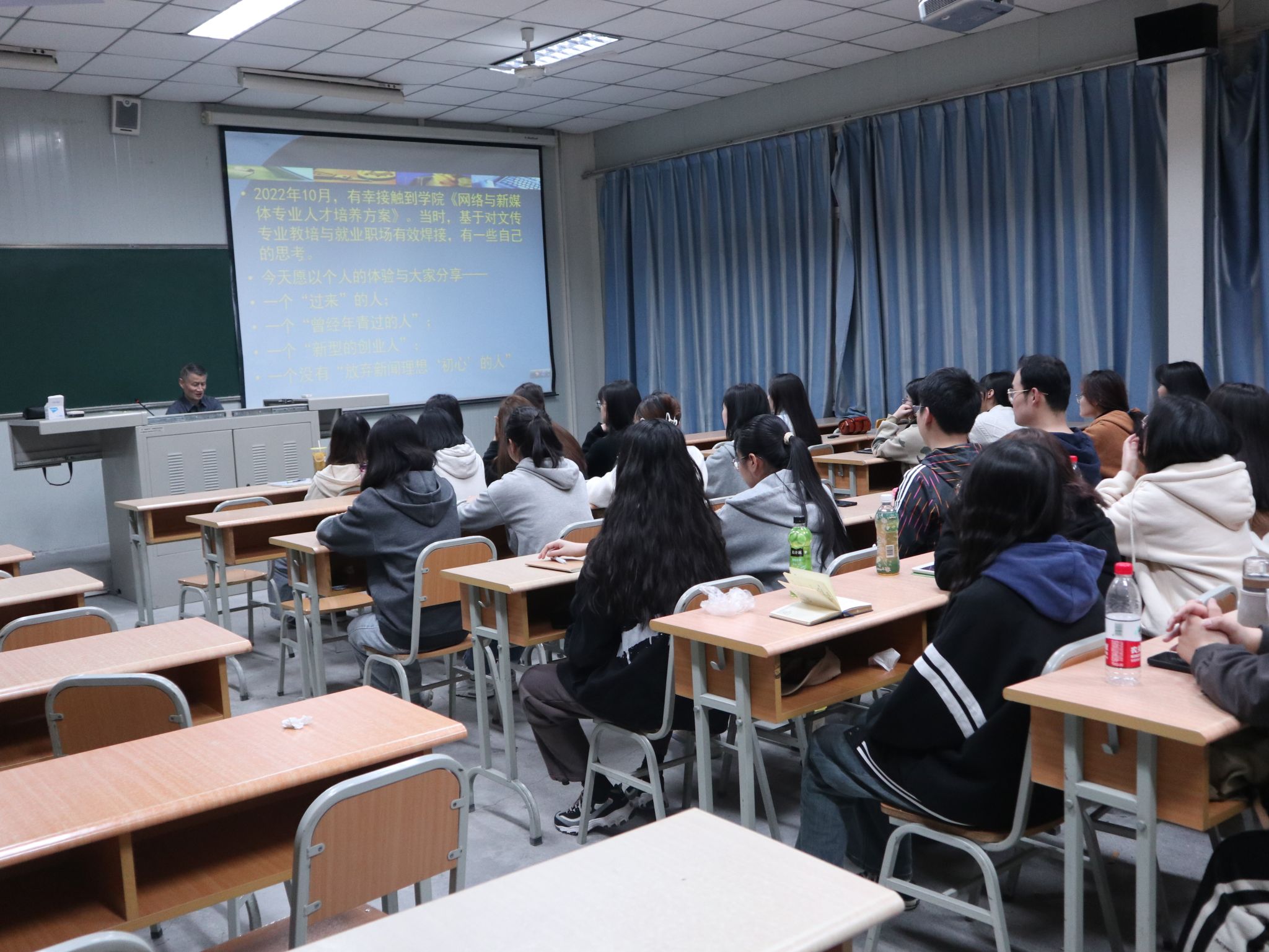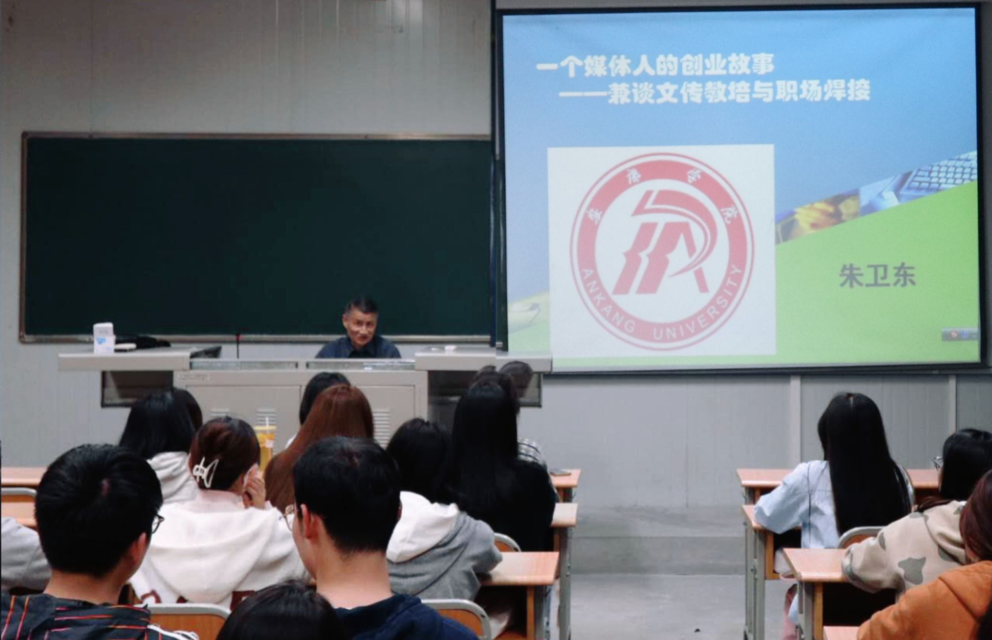 受太阳集团tcy8722邀请,原安康日报编委、新闻研究室主任朱卫东于2023年3月9日在1023教室为网络与新媒体专业2020级员工进行题为“一个媒体人的故事——兼谈文传教培与职场焊接”的专题讲座。讲座由秘书与新媒体系主任谭诗民主持。
