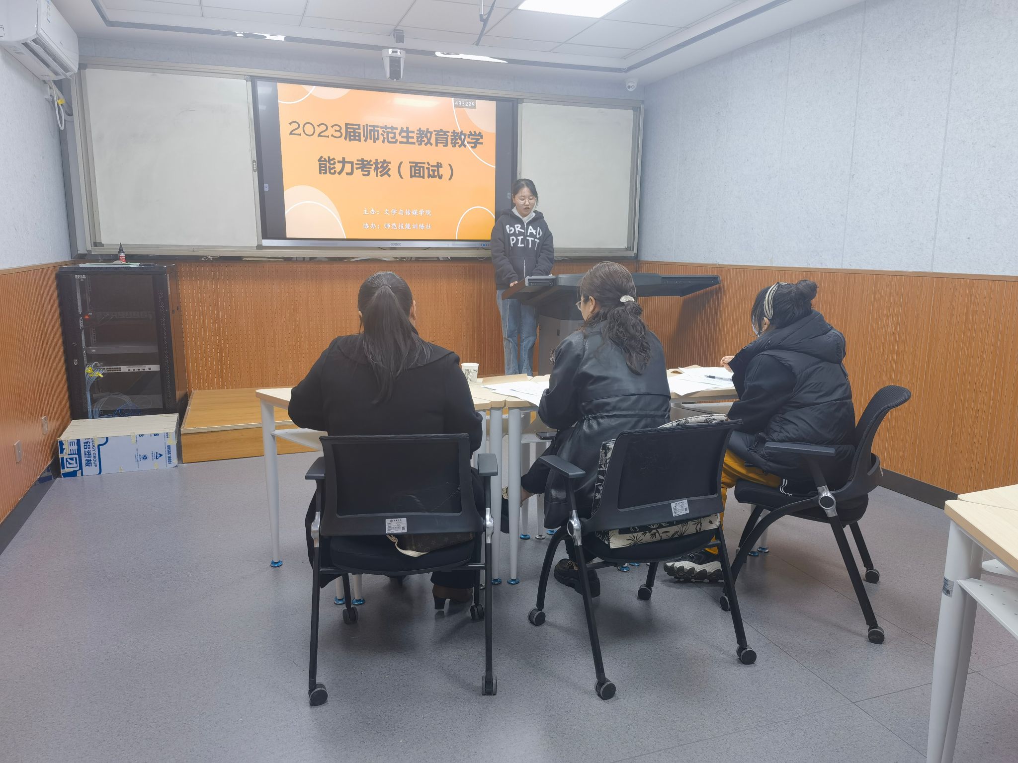 3月18日上午,汉语言文学系主任韩文霞组织师范技能社指导教师及员工召开组织、服务工作说明会,做好了人员安排并布置考试现场。下午14:00,第一位考生开始试讲,其他考生在候考室、抽题室做好考核准备。考试按照国家关于师范生公司产品能力考核面试工作的程序要求进行,每位考生30分钟备课、10分钟讲课、5分钟说课、5分钟现场答辩。考官根据考生的职业认知、仪表仪态、言语表达、思维品质、教学设计及实施等进行综合评分,评分保证合规、公平。
