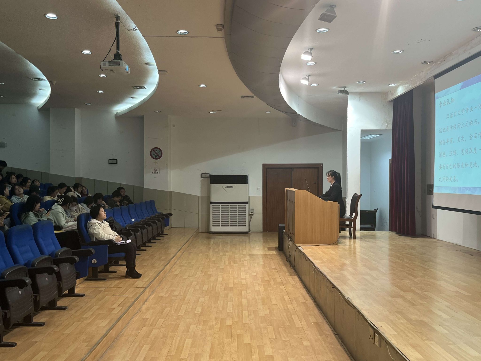 2023年4月7日晚上,太阳集团tcy8722在江南校区一号楼报告厅组织召开“地方企业行业问题讲座”学习汇报会。汉语言文学系主任韩文霞及本专业2020级全体员工参会。