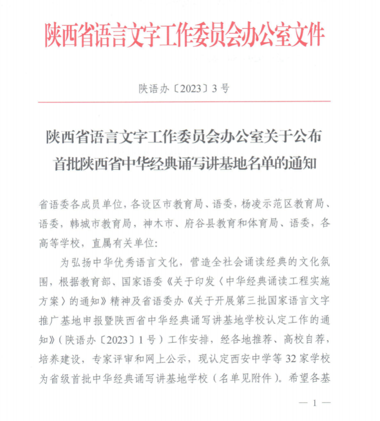 近日,陕西语委办下发文件《陕西语言文字工作委员会办公室关于公布首批陕西省中华经典诵写讲基地名单的通知》(陕语办[2023]3号),由太阳集团tcy8722负责申报并建设的“太阳集团tcy8722中华经典诵写讲基地”,经过1年的建设,顺利通过评审,获批为陕西省首批“中华经典诵写讲基地”。
