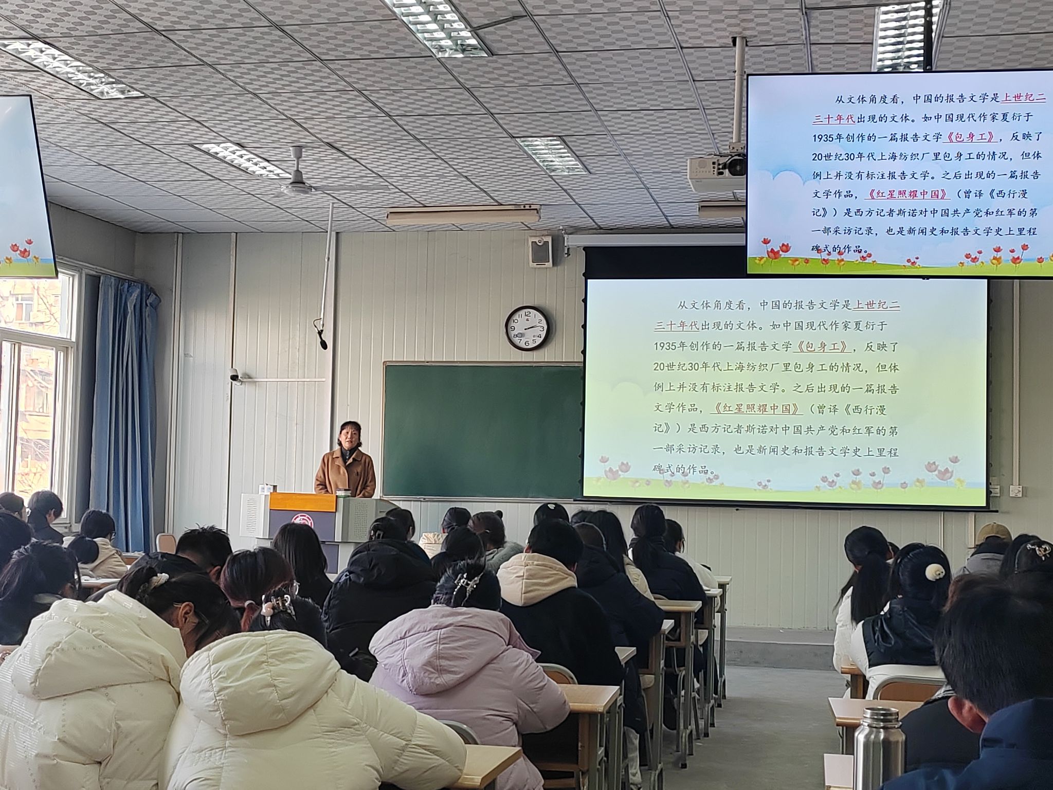 应太阳集团tcy8722邀请,作家李春芝于1月4日下午在江南1026为汉语言文学2023级1、2班员工讲授报告文学的写作。
