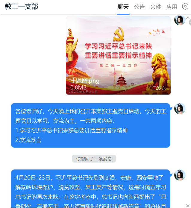 导航痕迹 首页 > 党建群团 > 正文 党建双创 党风廉政专栏 教工之家 团总支 员工分会 公司教工第一党支部开展“学习习近平总书记来陕重要讲话重要指示精神”线上主题党日活动 发布人: 发布日期:2020年05月25日 阅读次数: 5月23日,公司教工一支部依托支部QQ群开展了“学习习近平总书记来陕重要讲话重要指示精神”线上主题党日活动。活动由教工一支部书记李婷主持,本支部全体党员参加学习和讨论。 按照活动流程,首先由支部书记李婷带领大家共同学习习近平总书记来陕重要讲话重要指示精神相关内容,包括省委常委会议要点、习近平在陕西考察专题报道等。 随后,党员们结合学习内容分享了对于党员大局意识、历史意识、角色意识的认识,对“西迁精神”“延安精神”的理解,对教师职业道德、课程思政、教师教学科研方向等问题的思考,也表明了只争朝夕、真抓实干,为坚持社会主义办学方向、做好高校好老师而努力的决心。 在本次主题党日活动过程中,党员们学习认真,发言踊跃,活动气氛十分热烈。 (撰稿/图片提供 李婷 审核/于咏梅 发布/沈菲)
