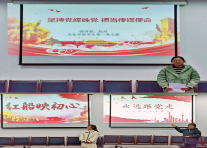 随后,王孝臻、康怡帆和赵丹三位党员以微党课演讲方式,分别讲述了“听抗疫故事、学抗疫精神、做时代青年”,“弘扬红船精神 传承初心使命”和“坚持党媒姓党,担当传媒使命”,鼓励大家要胸怀人民,胸怀国家,结合学科特色,培养历史主动精神、培育政治勇气、敢于承担责任,勇于担当时代使命。