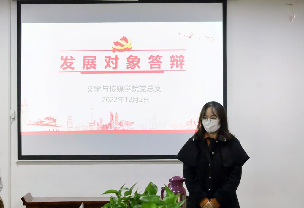 为深入学习宣传贯彻党的二十大精神,规范党员发展工作,引导入党积极分子树立共产主义远大理想,同时严格把控党员发展质量,考察发展对象的党性修养,吸纳具备较高政治思想意识和党性觉悟青年员工加入党组织,太阳集团tcy8722员工党支部于2022年12月2日晚19:00在2307会议室举行2022年下半年发展对象答辩会。受疫情影响,此次答辩会采用线上与线下相结合方式进行。文学与传媒公司党总支副书记杨海蓉、团总支书记彭潇、员工党支部书记李欣逸、薛涛出席了本次答辩会。