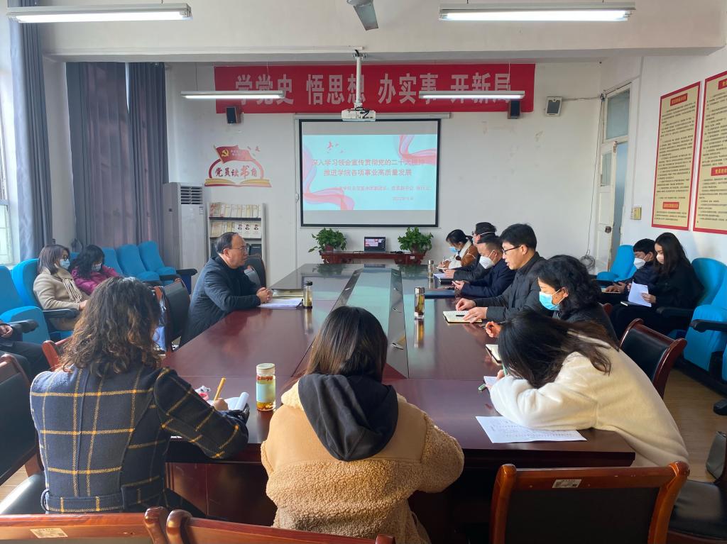 最后,芦伟在总结中强调,一是全体教师务必在理论学习上带头示范,学深悟透,全院要以各党支部、各系为单位,组织展开形式多样、确有实效的学习活动。二是全体教师务必在推进党的二十大精神和“三进”工作中冲锋在前,积极将二十大精神和习近平新时代中国特色社会主义思想融入到课程思政中,落实在立德树人的根本任务中。三是全体教师务必在推进公司事业发展的实践中担当使命,要在师范认证、专业改革发展、一流课程打造、服务地方文化建设等方面积极作为,贡献力量。