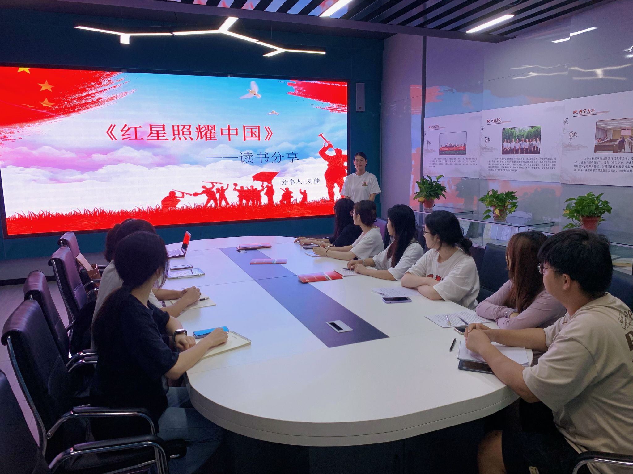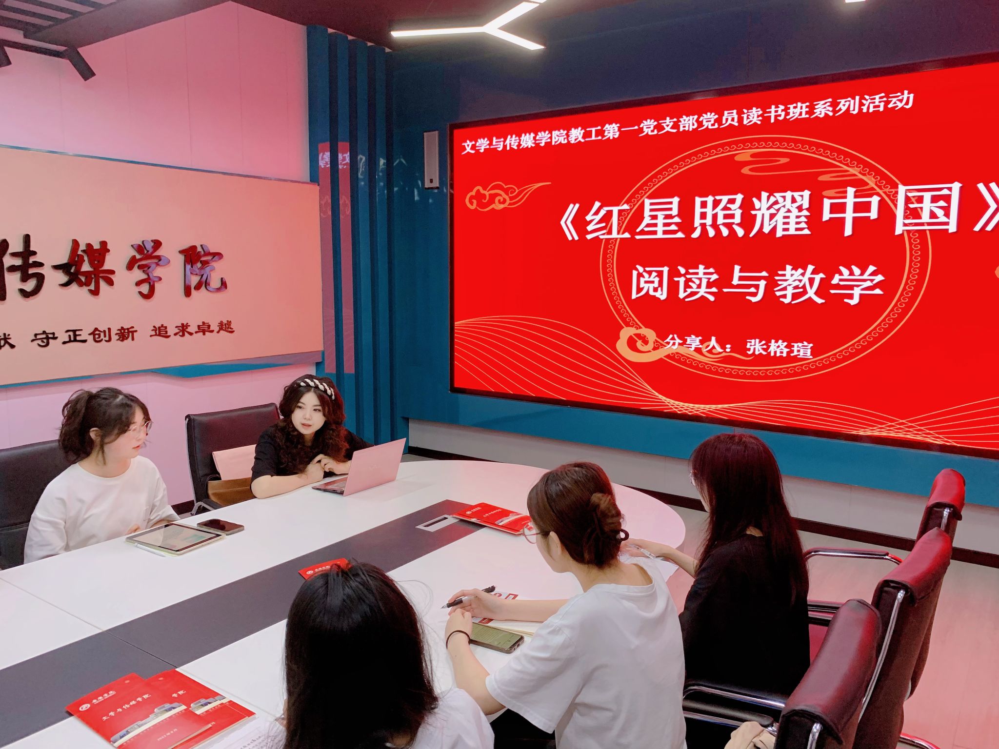 6月21日下午,公司教工一支部党员教师张格瑄召集所联系的入党积极分子、培养对象和预备党员在2309教室围绕美国记者埃德加·斯诺创作的红色经典纪实文学作品《红星照耀中国》展开阅读与教学分享活动,活动由张格瑄老师主持。