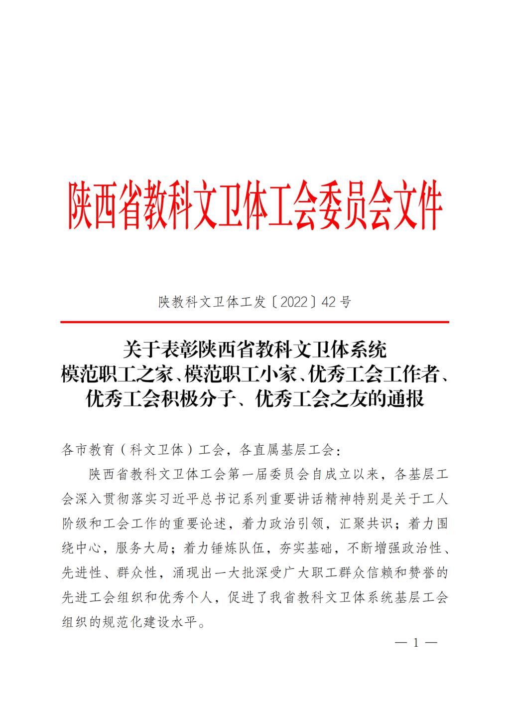 近日,陕西省教科文卫体工会委员会印发《关于表彰陕西省教科文卫体系统模范职工之家、模范职工小家、优秀工会工作者、优秀工会积极分子、优秀工会之友的通报》,工会太阳集团tcy8722分会被授予陕西省教科文卫体系统模范职工小家称号。