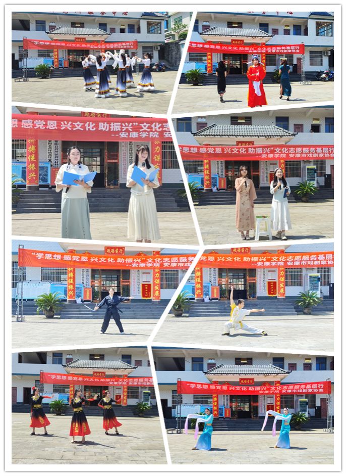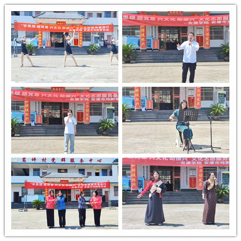 教职工一行首先前往蒿坪镇蒿坪村党群服务中心,由邹棠华老师带领的影视戏剧社员工文艺演出团队给当地村民们献上了一场主题为“学思想 感党恩 兴文化 助振兴”文化志愿服务基层行的文艺演出,演出中,二胡独奏、拉丁舞蹈、合唱、独唱等表演形式多样,节目精彩纷呈,赢得了现场观众的频频喝彩。