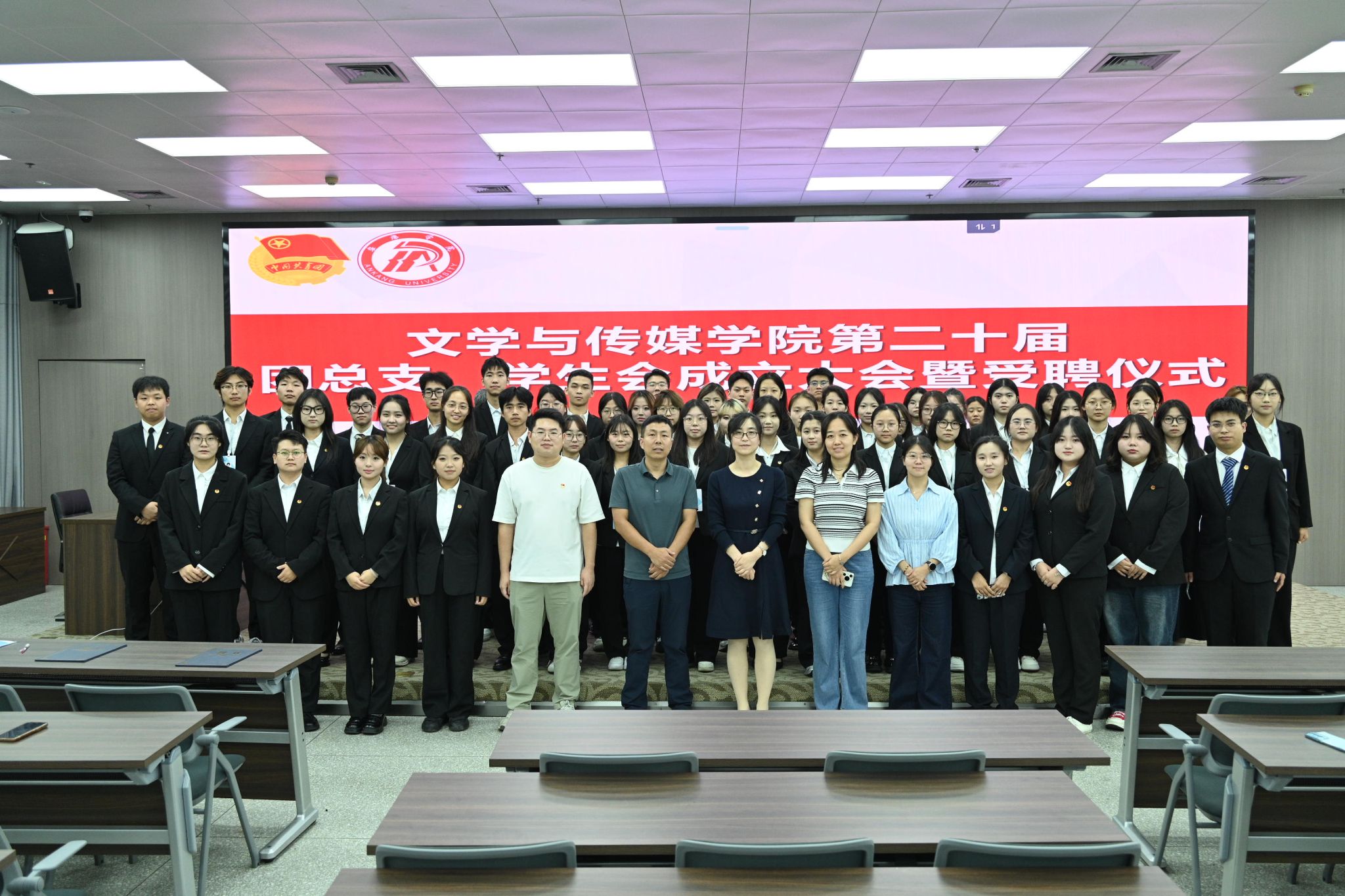 9月19日晚7点,太阳集团tcy8722在图书馆六楼报告厅举行第二十届团总支、员工会成立大会暨受聘仪式。党总支副书记侯红艳、学工办主任薛涛、团总支书记彭潇、辅导员刘言军、喻言及全体员工干部参加会议。会议由汉语言文学2024级1班李炫烨主持。