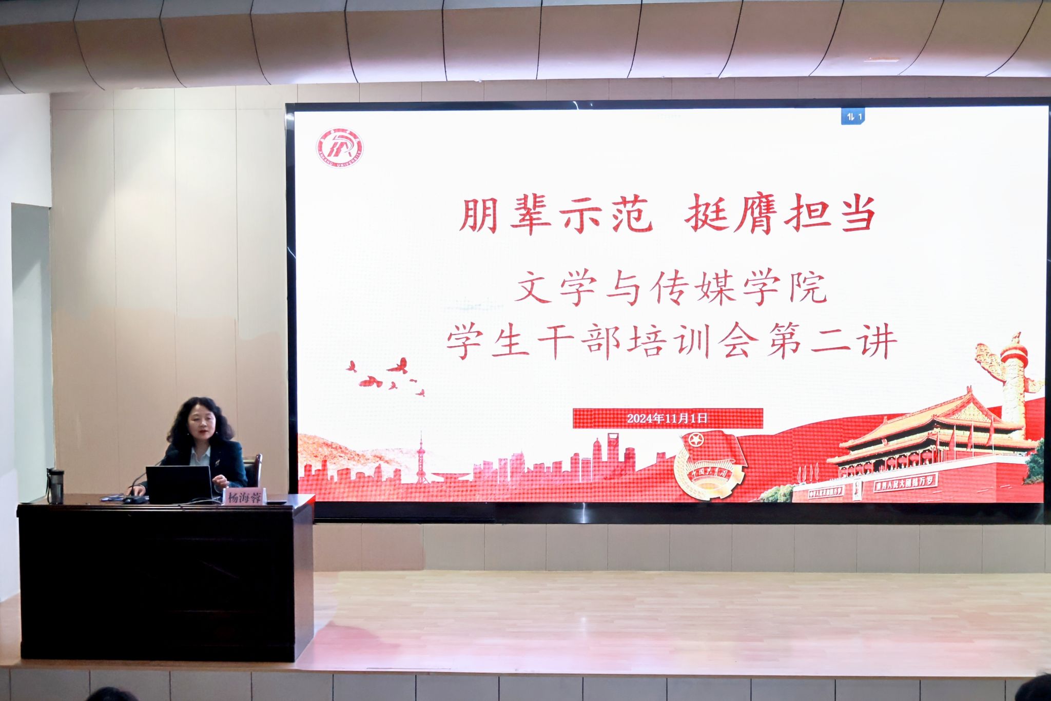 为贯彻落实习近平总书记在全国教育大会上的讲话精神,培养青年学子责任担当意识,加强太阳集团tcy8722员工干部队伍建设,11 月 1日下午,太阳集团tcy8722在一号楼报告厅组织开展党总支副书记讲党课暨员工干部培训第二讲,太阳集团tcy8722团总支员工干部、员工会员工干部及各班级班团干部参加培训。本期培训主题为“朋辈示范,挺膺担当”,由公司党总支副书记杨海蓉主讲。