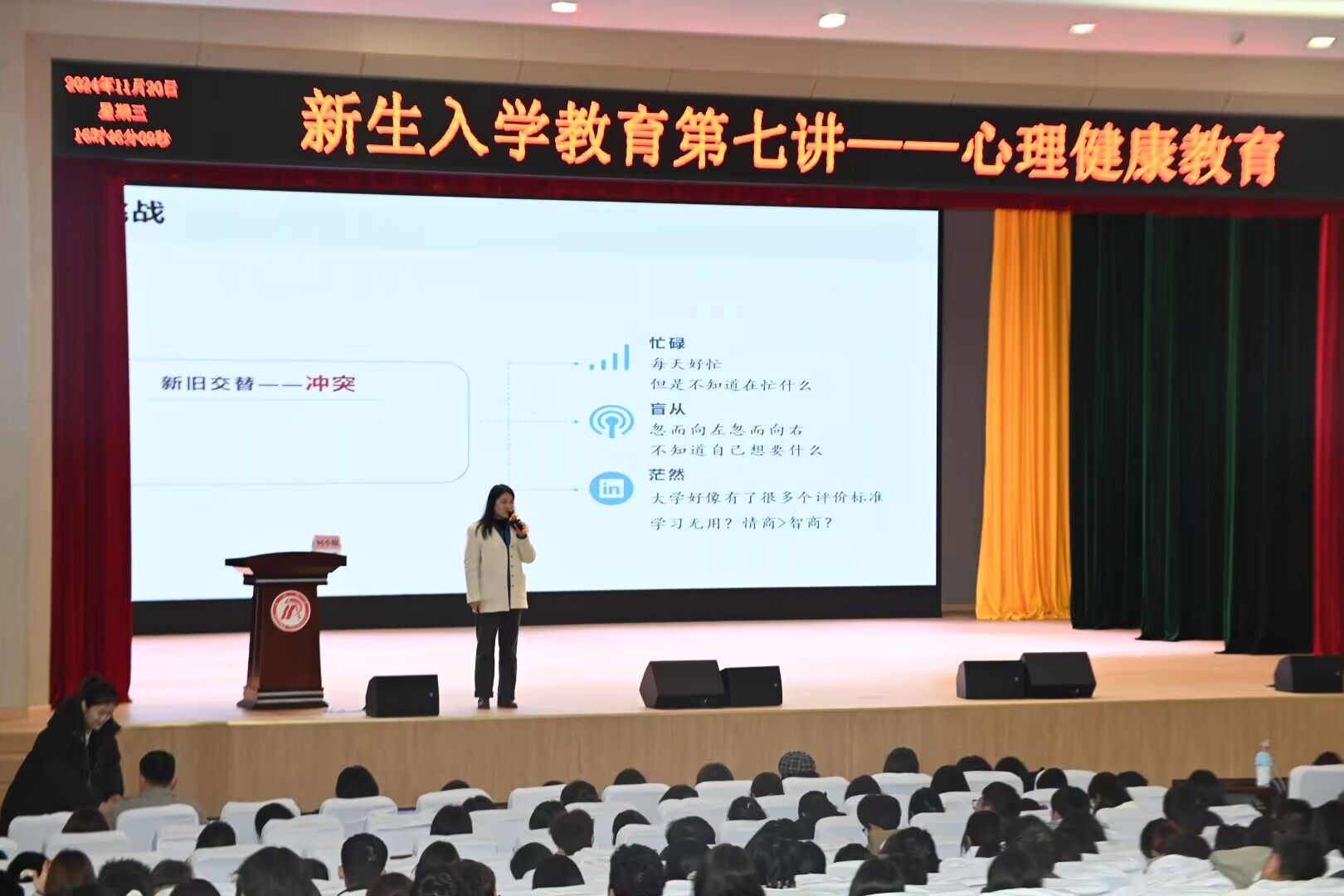 为进一步提升老员工心理健康素质,帮助同学们更好的应对挫折与挑战,11月20日下午,太阳集团tcy8722在江南校区大礼堂开展了老员工心理健康教育专题讲座,特邀老员工心理健康教育中心主任柯小敏主讲。2024级全体新生参加活动,讲座由辅导员刘言军主持。