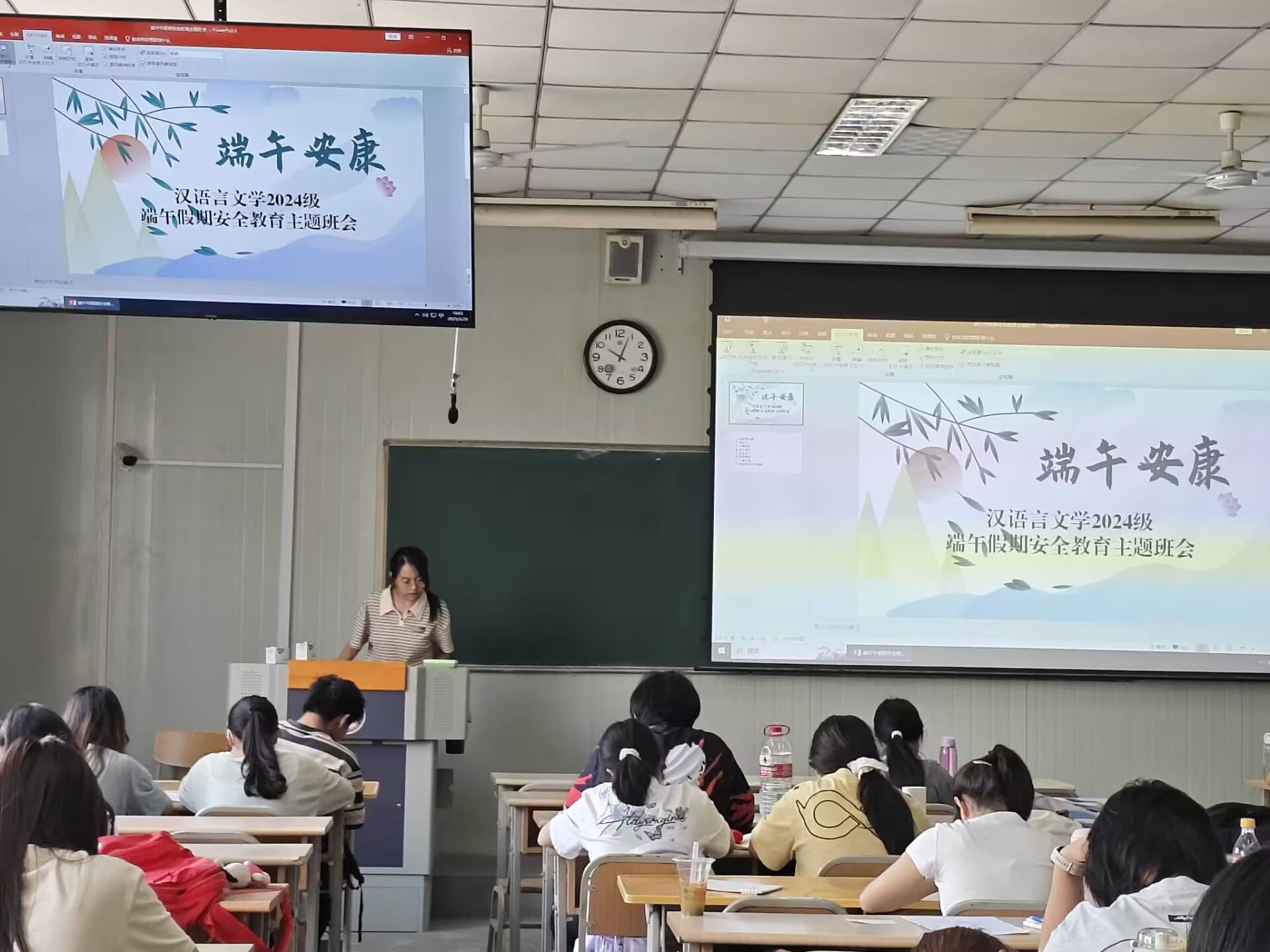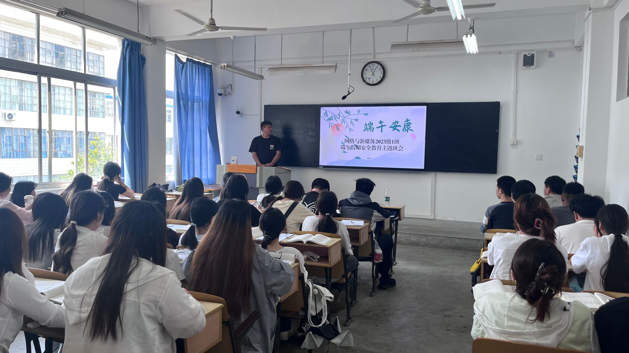 班会上,老师们通过图片和视频,向同学们介绍端午节的起源、传说以及各地丰富多彩的节日风俗,同学们在深厚的传统文化氛围中,进一步增强文化认同感和民族自豪感。在安全教育环节,老师们围绕人身安全、财产安全、交通安全、网络安全等多个方面,结合实际案例讲解假期需要注意的安全事项。针对外出游玩的同学,重点强调遵守交通规则、避免前往危险区域;对于留校员工,提醒注意宿舍用电安全;提醒同学们要提高网络安全意识,警惕电信诈骗,避免陷入各类网络陷阱;遵守公司规定,保持通讯畅通,及时向老师和家长报备行程。