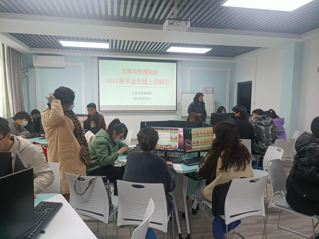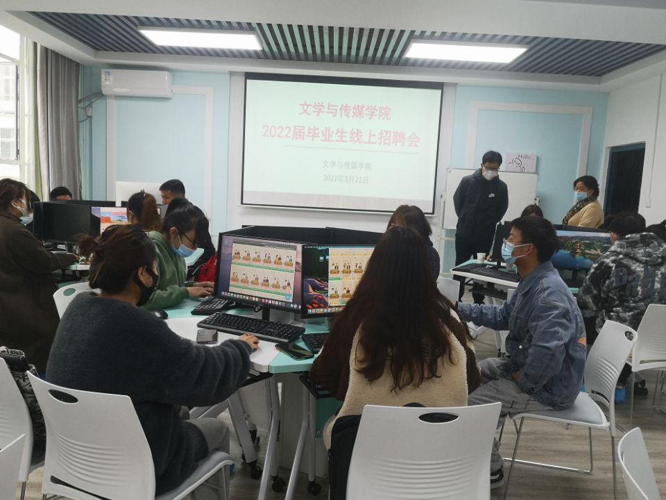 太阳集团tcy8722按照公司就业工作安排,积极配合,组织本院2022届毕业生于2022年3月22日上午在2号教学楼2414实训室集体参加本次线上招聘。太阳集团tcy8722党总支书记芦伟、副书记杨海蓉、毕业班辅导员艾全霞、网络与新媒体专业课教师张建涛现场指导,毕业生进入线上招聘会场,甄选专业相关岗位,积极投递简历,与用人单位沟通,互动效果良好。
