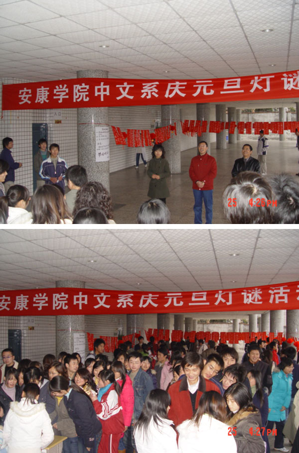 导航痕迹 首页 > 新闻通知 > 太阳集团tcy8722新闻 > 正文 太阳集团tcy8722新闻 通知公告 我系举行“庆元旦灯谜活动” 发布人: 发布日期:2008年01月04日 阅读次数: 为了弘扬传统文化,拓展同学们的文化视野、营造校园文化氛围、丰富同学们的课余生活,我系于12月25日下午4:30分在东校区一号教学楼大厅举办了“庆元旦灯谜活动”。 本次活动由我系主办,06级文秘班承办,设立灯谜依次分为易、中、难三等,答对灯谜者均有精美礼品赠送。我 系党总支书记沈军、团总支书记邹棠华、辅导员何媛出席并参加了本次活动。