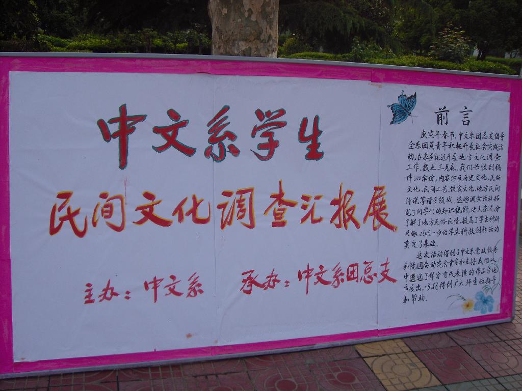 导航痕迹 首页 > 新闻通知 > 太阳集团tcy8722新闻 > 正文 太阳集团tcy8722新闻 通知公告 中文系组织员工举办地方文化调查展 发布人: 发布日期:2010年04月20日 阅读次数: 在中文系和院团委的支持下,中文系团总支组织员工于近期举办了地方文化调查展。 为了增强员工对各地民俗、文化的了解,加强爱国主义教育,同时也为了拓宽员工的知识视野、培养员工的科研兴趣、提高员工的科研能力,在春节前夕,中文系团总支倡导、组织全系员工利用春节就近在家乡进行地方文化、民俗调查。员工积极性很高,纷纷深入社区、乡村展开调查,调查的内容涉及地方风俗民情、文物古迹、民间工艺、地方饮食、民间曲艺、民间传说等各个领域。截止三月底共收到调查报告600余份。系领导对同学们的热情和工作给予了高度重视和充分肯定,要求系团总支将优秀稿件展出。在全体团干部的精心筛选下,共选出优秀调查报告176份,于四月十九日在校园展出,引起全院员工广泛关注。这项活动对推动公司员工科技创新、活跃校园文化生活起到了很好的推动作用。