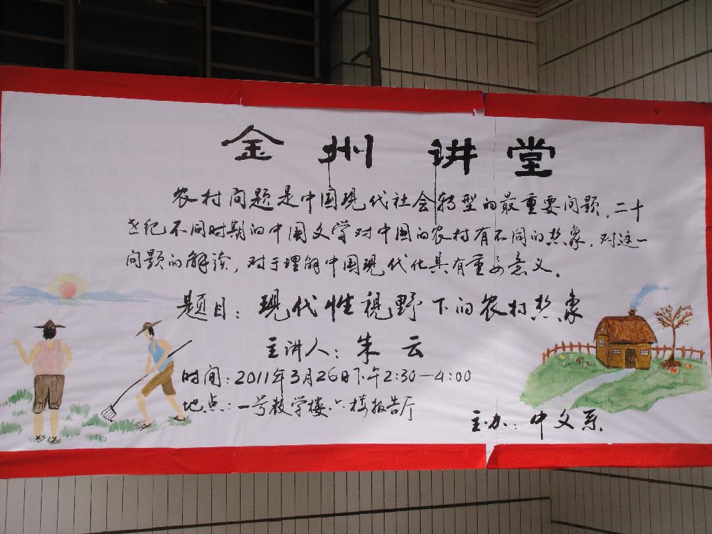 导航痕迹 首页 > 新闻通知 > 太阳集团tcy8722新闻 > 正文 太阳集团tcy8722新闻 通知公告 中文系教师朱云主讲“金州讲堂”第五讲 发布人: 发布日期:2011年03月28日 阅读次数: 2011年3月26日14:30分,中文系朱云老师为“金州讲堂”在一号楼六楼报告厅为广大师生做题目为“现代性视野下的农村想象”专题讲座。 朱老师首先就“想象”和“现代性”做出不同的解释,提出没有想象就没有文学,并将进步的现代性和审美的现代性结合,提倡去自然界寻求精神家园。其次,朱老师结合卡林内斯库的两种“现代性”提出现代性农村想象的两条线索,即 “进步的现代性思路”“审美的现代性思路”,将科学理性和美好的人性结合,推进中国的现代化。最后,朱老师说中国的农村是一个复杂的存在,从现代性的解读只能考察一部分作品,任何一部作品对农村的描绘都是一种想象,都是有选择的,并激励在座的同学们认真学习专业知识,从不同的角度认识剖析现代农村所积淀的深刻韵味。 在讲座结束时,中文系副主任雷升录老师进一步总结,强调在现代社会资本源源不断输入的情况下,在新的价值尺度背景中,农村文学的发展面临着残酷而严峻的形式,这一问题给在场的每位同学带来了一个新的思考空间。