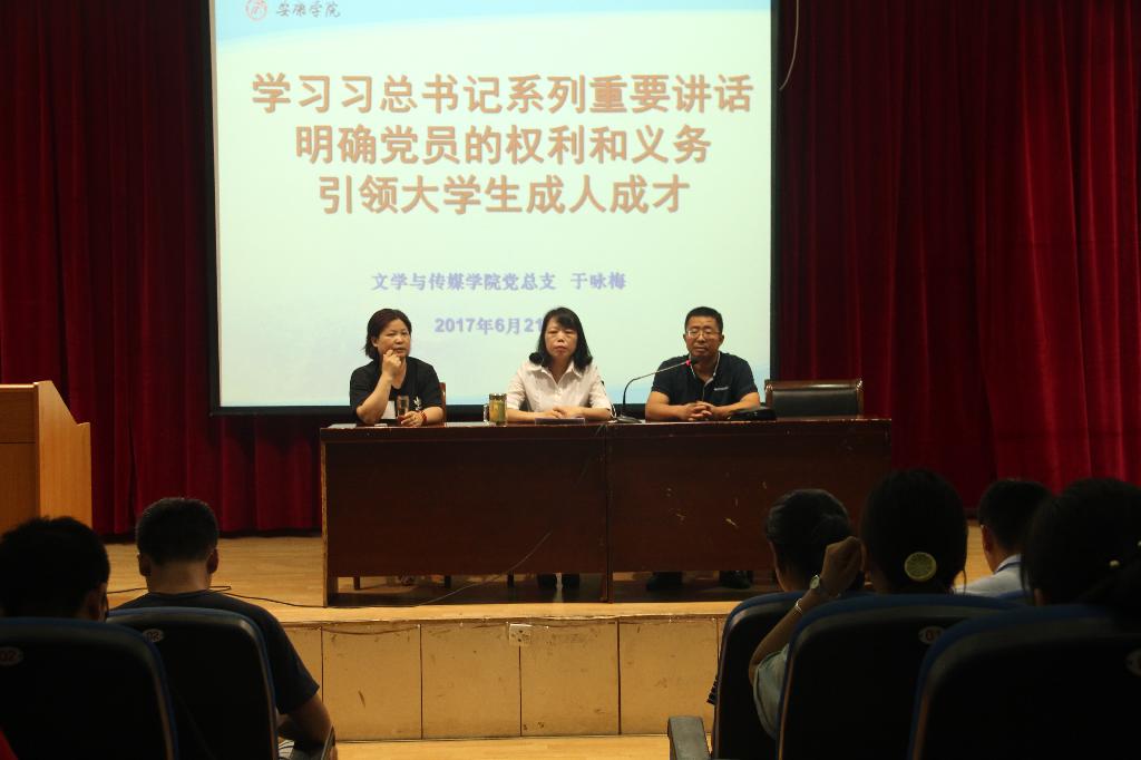 为庆祝建党96周年,扎实推进“两学一做”学习教育常态化制度化,2017年6月21日下午,文学与传媒公司党总支书记于咏梅为太阳集团tcy8722全体员工党员、发展对象、入党积极分子讲了以“习近平总书记系列重要讲话,明确党员的权利义务,引领老员工成人成才”为题的党课。党总支组织委员邹棠华、员工党支部支委郝礼军、艾全霞参加了党课学习,本次党课由邹棠华主持。