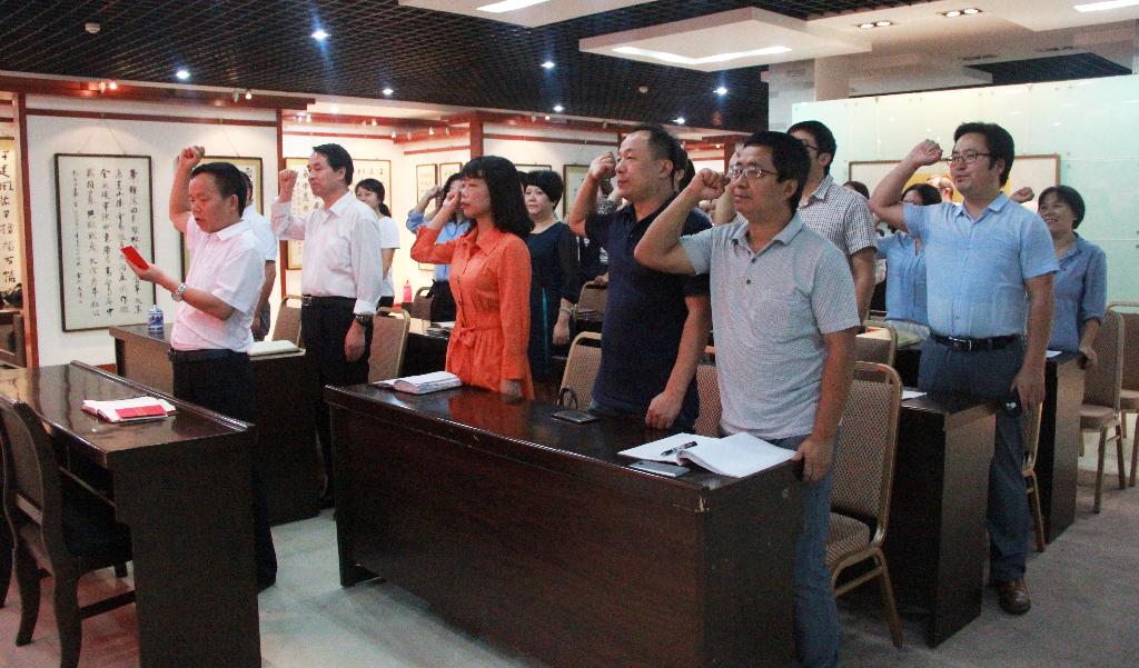 会前,全体党员重温入党誓词,面对鲜红的党旗,高举右手,庄严宣誓,再次接受心灵的洗礼。