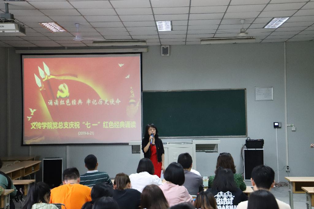 于咏梅以“我们为什么要坚定理想信念?”“我们的入党初心是什么?”“革命先烈用热血与青春换来的幸福生活我们今天还有什么理由不去珍惜?”三个问题为切入口,引发与会人员深思,同时也谈了三点感受与师生共勉:一是尊重红色经典,铭记自己的初心。尊重红色经典,就是对历史的尊重。实现中华民族伟大复兴的中国梦,需要从这些红色经典中汲取宝贵的精神营养。我们应当把个人理想和党的理想相结合,树立共产主义理想,充分发挥党员的模范带头作用,铭记入党时的初心,不忘初心,砥砺前行;二是积极传承红色基因,将爱国之情固化于行。爱国不是一句空洞的口号,要充分发挥思政课程和课程思政主渠道作用,利用社会实践、志愿活动、社团活动、新媒体平台等其他途径,采取专题讲座、现场教学、参观考察、学习交流等方式,帮助员工树立正确世界观、人生观、价值观,引导员工培育和践行社会主义核心价值观,做中国优秀传统文化、社会主义先进文化和革命文化的传承者的积极传承者,理性爱国,做到“利于国者爱之,害于国者勿之”,将爱国之行化为报国之志,努力成长为担当民族复兴大任的时代新人;三是通过开展诵读红色经典活动,使专业核心能力得到检验。通过这样的平台,让更多的同学敢于站在台上,充分的展现和检验了“能说”的专业技能。