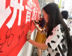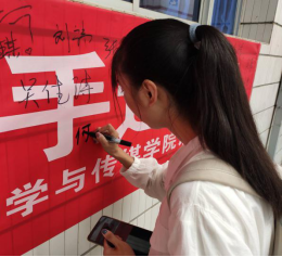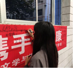 语言文字社社员在江南校区一号餐厅外拉开“同讲普通话,携手进小康”的横幅,并引导参加活动的师生在横幅上签字留影。