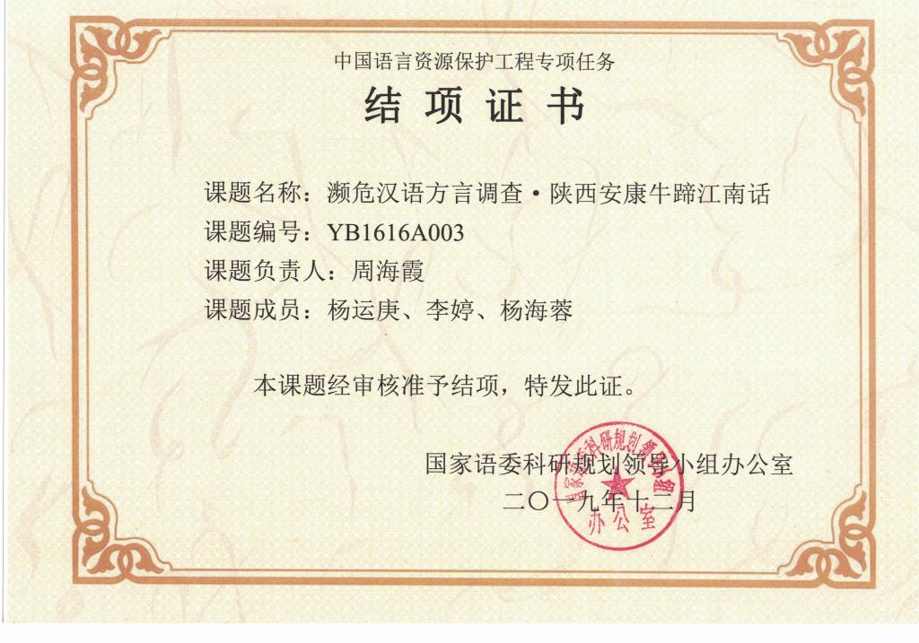 导航痕迹 首页 > 新闻通知 > 太阳集团tcy8722新闻 > 正文 太阳集团tcy8722新闻 通知公告 公司教师周海霞主持的中国语言资源保护工程重点专项项目顺利结题 发布人: 发布日期:2020年10月28日 阅读次数: 公司教师周海霞主持的中国语言资源保护工程重点专项项目“濒危汉语方言调查·陕西安康牛蹄江南话”顺利通过结题验收,音频、视频、文字资料全部合格并收入中国语言资源库。 “濒危汉语方言调查·陕西安康牛蹄江南话”项目2016年4月正式被国家语委科研规划领导小组办公室立项,到账经费18万元,牛蹄江南话也是本批中国语言资源保护工程项目确定列入的陕南范围内的唯一一个濒危汉语方言保护调查点。本项目研究历时三年六个月,项目成果录制音频、视频资料各3828条,收集方言民俗照片100余幅,形成方言志书文字材料30余万字。 撰稿/周海霞 审核/杨运庚 发布/崔瑜