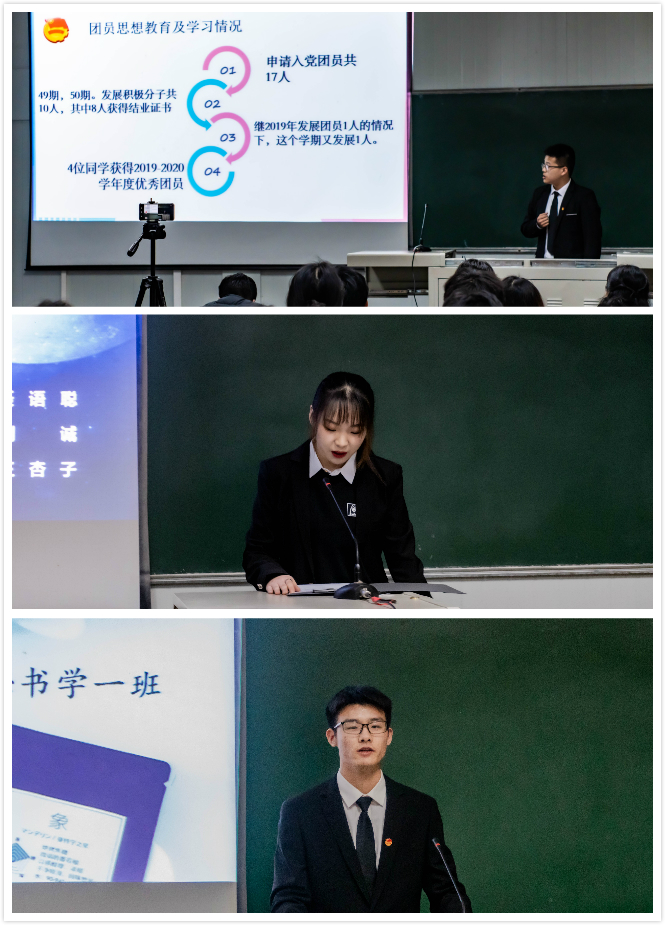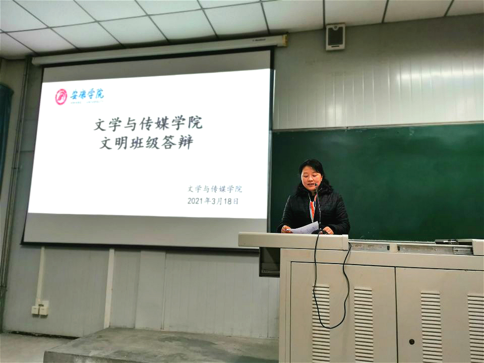 为推进公司学风建设,增强班集体的凝聚力,充分发挥文明班级的示范引领作用,2021年3月18日19:00,太阳集团tcy8722在1012室举行了2020—2021学年度文明班集体答辩活动。本次活动由党总支副书记杨海蓉、学工办主任薛涛、团总支书记彭潇、辅导员艾全霞担任评委,公司2018—2020级的各班员工骨干参与此次答辩。活动由汉语言文学19级1班路怡鸿主持。