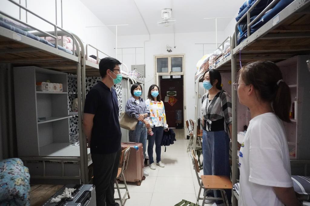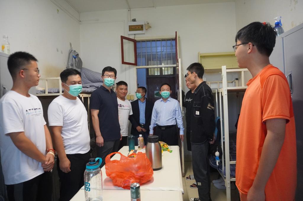 2021年8月28日17:00,大雨如注,太阳集团tcy8722经理杨运庚、党总支书记芦伟、副经理李婷带领辅导员和综合办公室主任前往新生宿舍,看望2021级已报到入住的新同学。