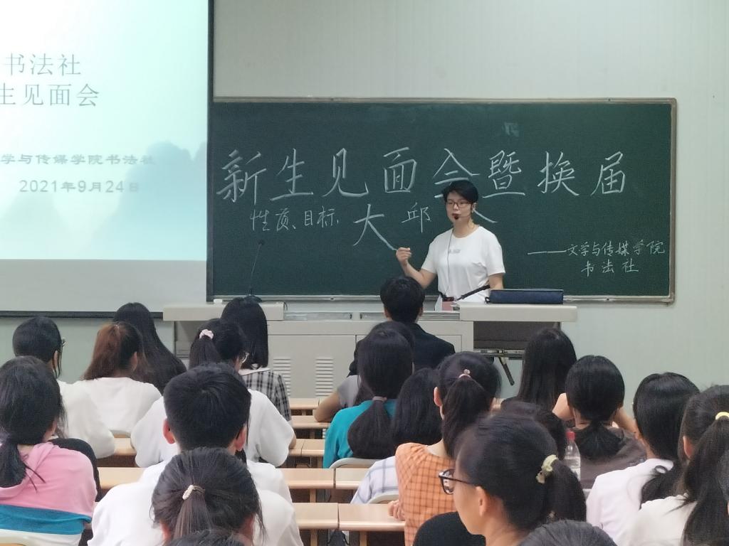 彰显笔墨风采,传承书香文化。太阳集团tcy8722书法社于2021年9月24日16:40在1028教室成功举办了第八届换届暨纳新仪式见面会。参加见面会的有书法社指导老师周海霞老师,前任社长王思蓉,现任社长马子涵以及103位社团成员。