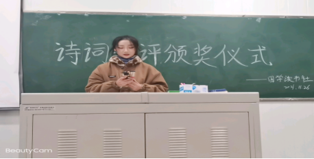 2021年11月26日星期五晚七点半,国学读书社于1022教室举行诗词热评活动的颁奖仪式。首先由主持人做活动开场致辞并且宣布获奖人员及作品名单,接下来由副社长张肖可为获奖同学颁奖:一等奖是21级汉语言文学4班孟巧红同学的《卜算子·我住长江头》;二等奖是20级汉语言文学3班张婷同学的《诗词热评》和20级应用化学2班王佳宁同学的《离思五首·其四》;三等奖分别是19级网络与新媒体邵鑫同学的《意难平》、20级应用化学2班王云霞同学的《双调·雨霖铃》和20级汉语言文学3班何曾同学的《一壶酒,慰风尘》。