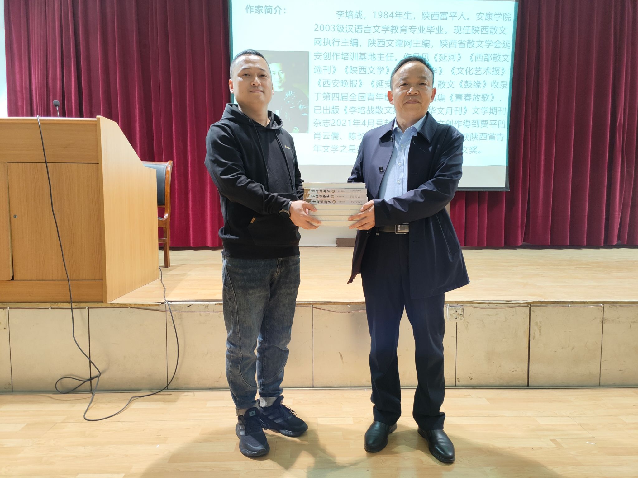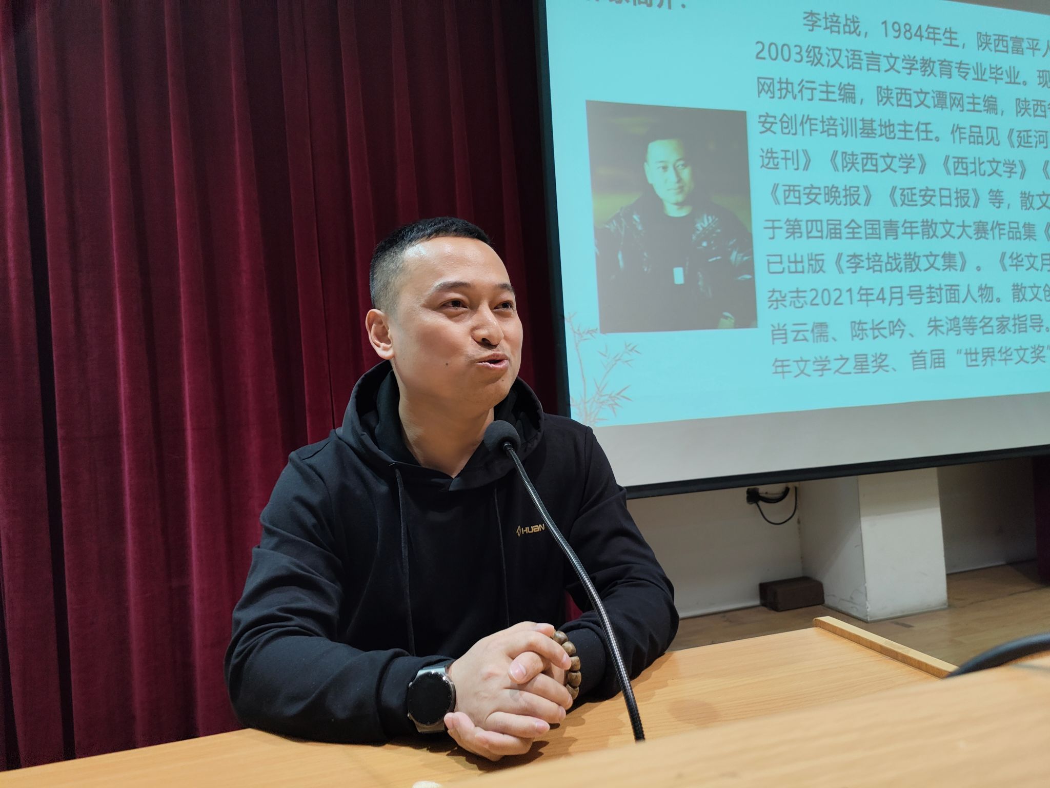 为充分发挥员工榜样力量,聚合员工资源强化育人,2023年4月12日下午,太阳集团tcy8722邀请汉语言文学专业2006届员工、现任陕西散文网执行主编、陕西文谭网主编、陕西省散文学会延安创作培训基地主任李培战在一号教学楼六楼报告厅举办文学创作报告会。太阳集团tcy8722经理杨运庚、党总支副书记杨海蓉、辅导员邹棠华,影视戏剧社、文学创作社、风华诗社共计二百余人到场聆听。本次报告会由杨海蓉主持。