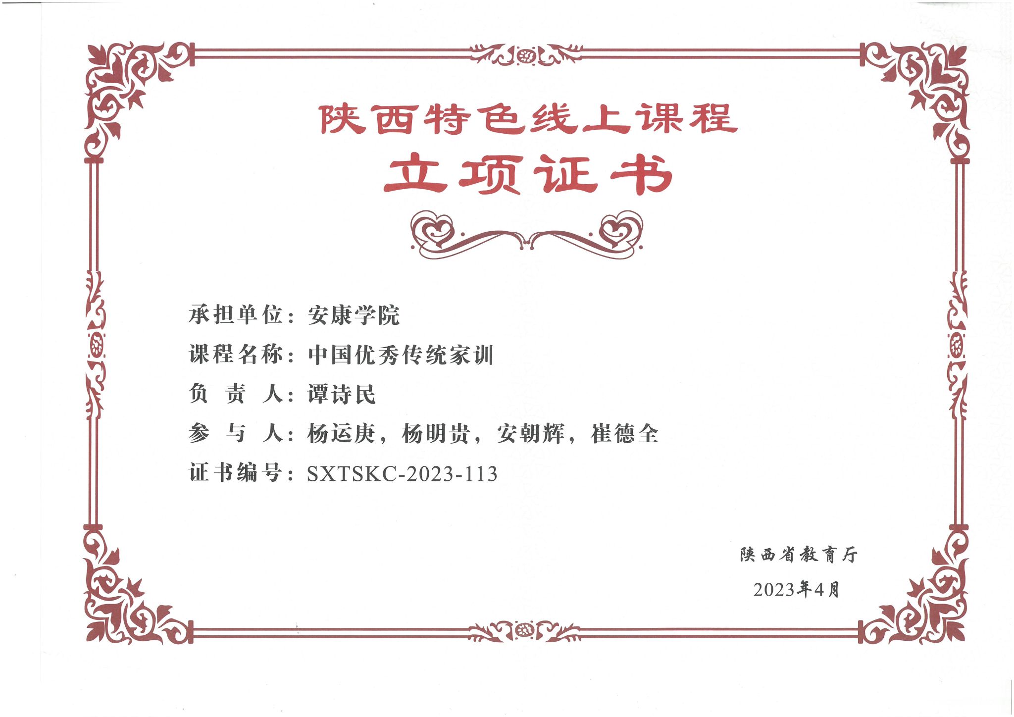 4月20日,陕西省委教育工委、省教育厅组织召开了陕西数字教育大会。大会以“数字化赋能教育高质量发展”为主题,包括主会场及基础教育、职业教育和高等教育等3个分会场活动。高等教育分会场活动中发布了陕西特色线上课程立项建设名单,并向教师代表颁发了立项证书。公司谭诗民博士主持申报的《中国优秀传统家训》课程获陕西特色线上课程立项建设,并参会领取了立项证书。