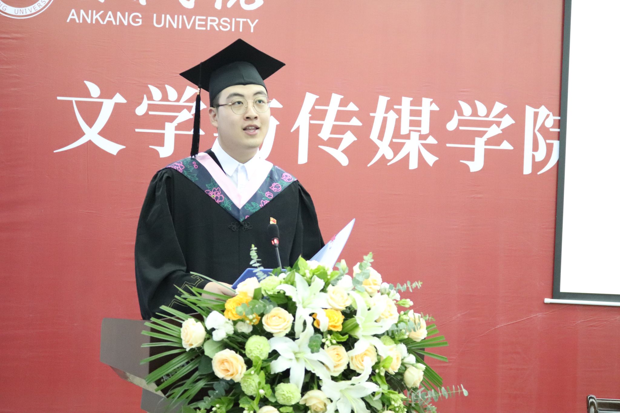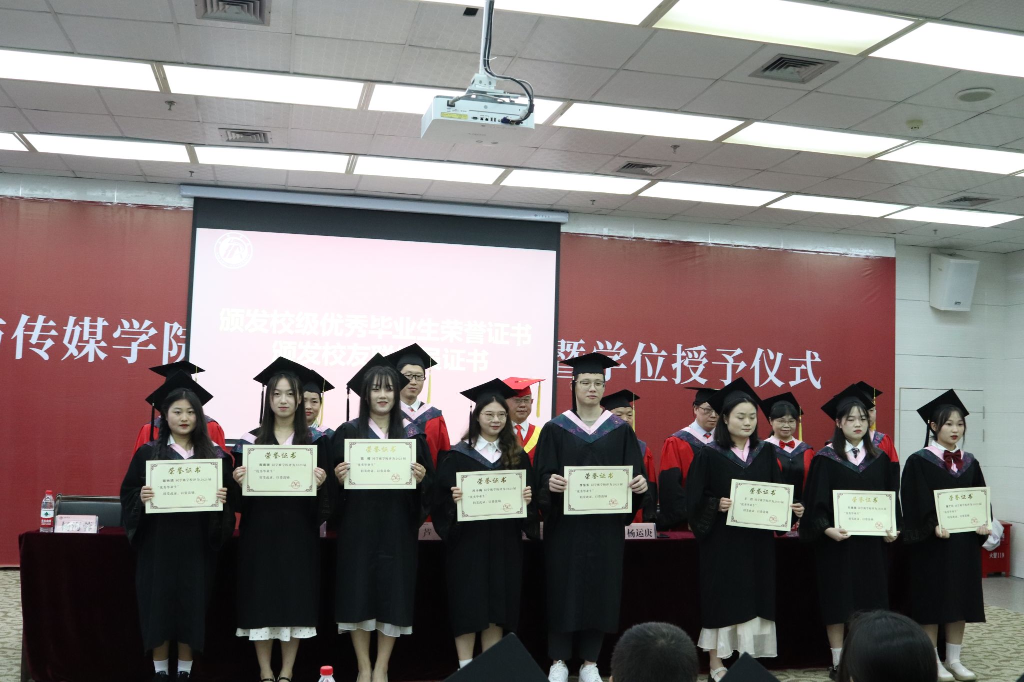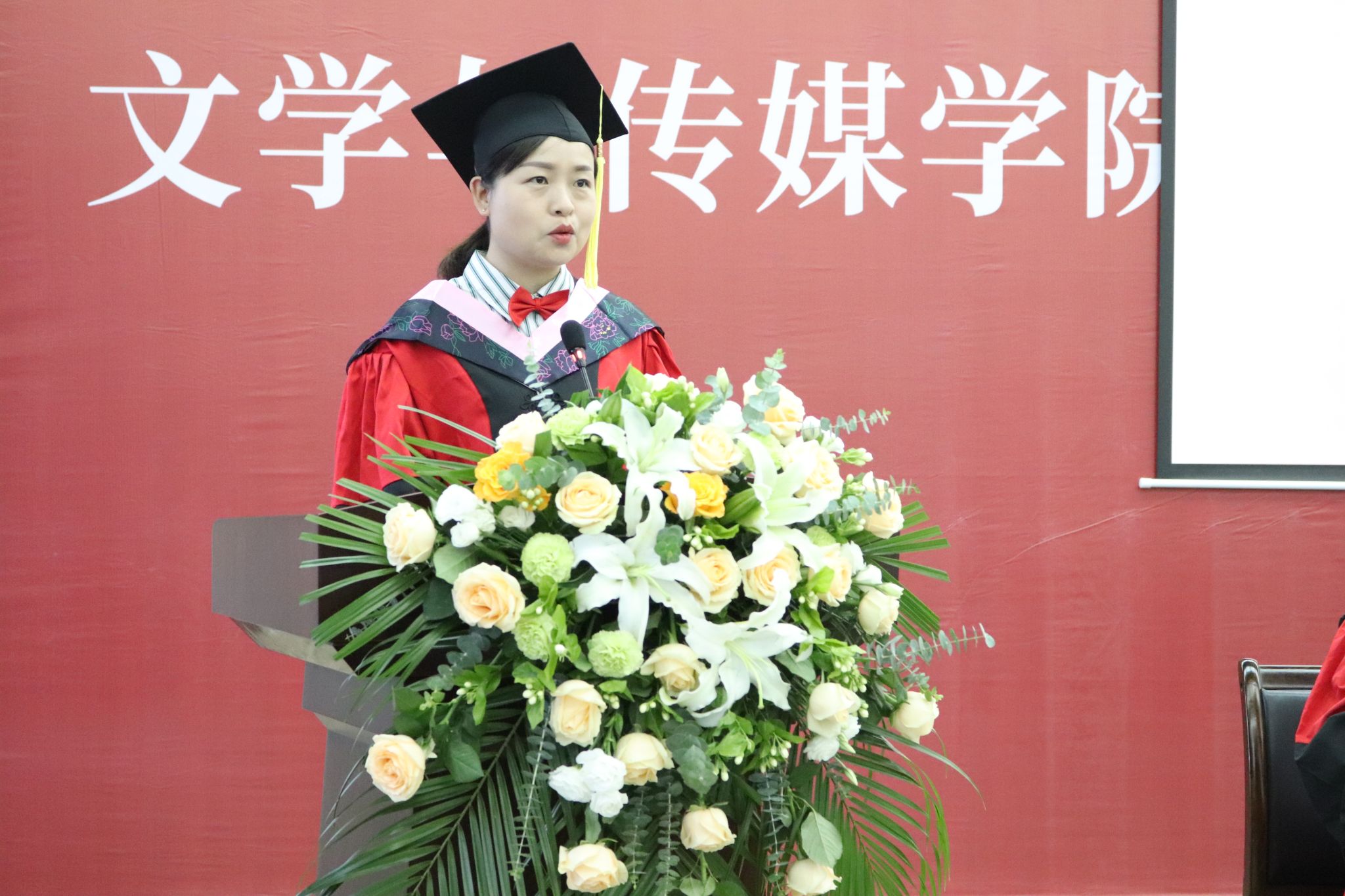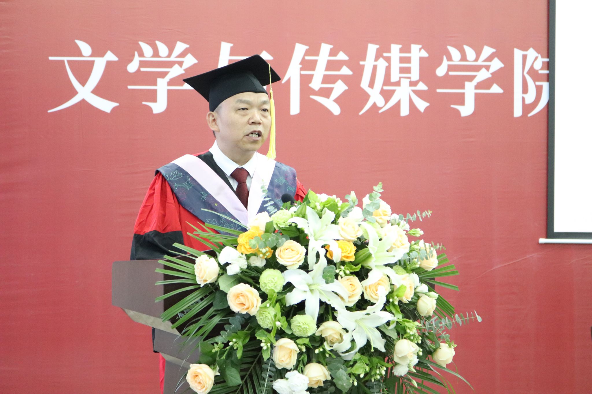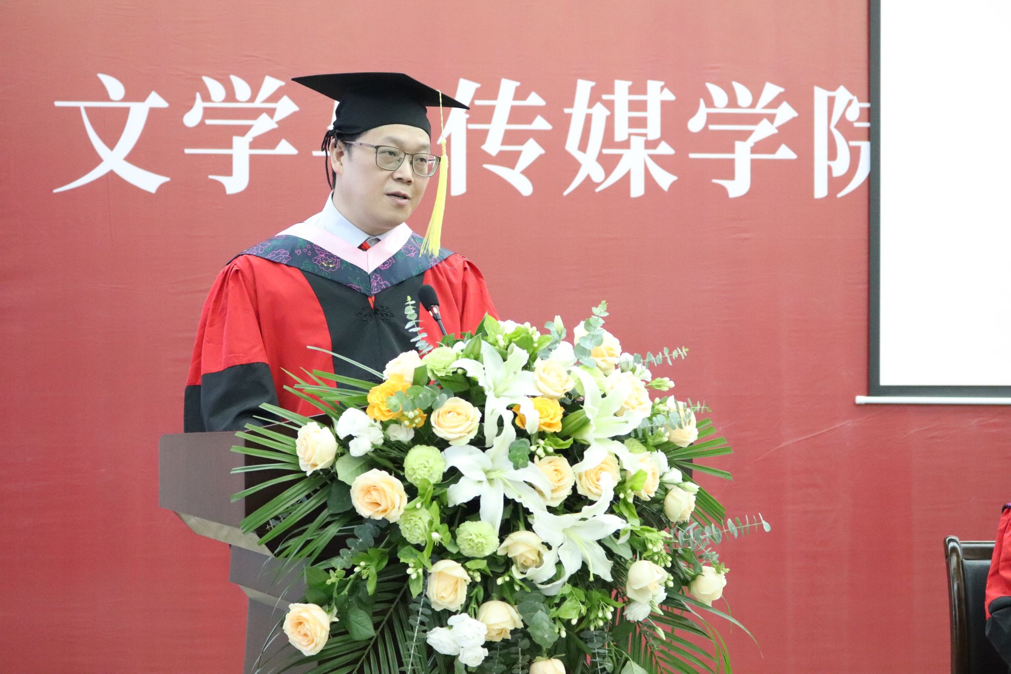 文学与传媒公司党总支书记芦伟宣读了《关于授予2023届本科毕业生学士学位的决定》,并对顺利获得学士学位的各位同学表示热烈的祝贺。