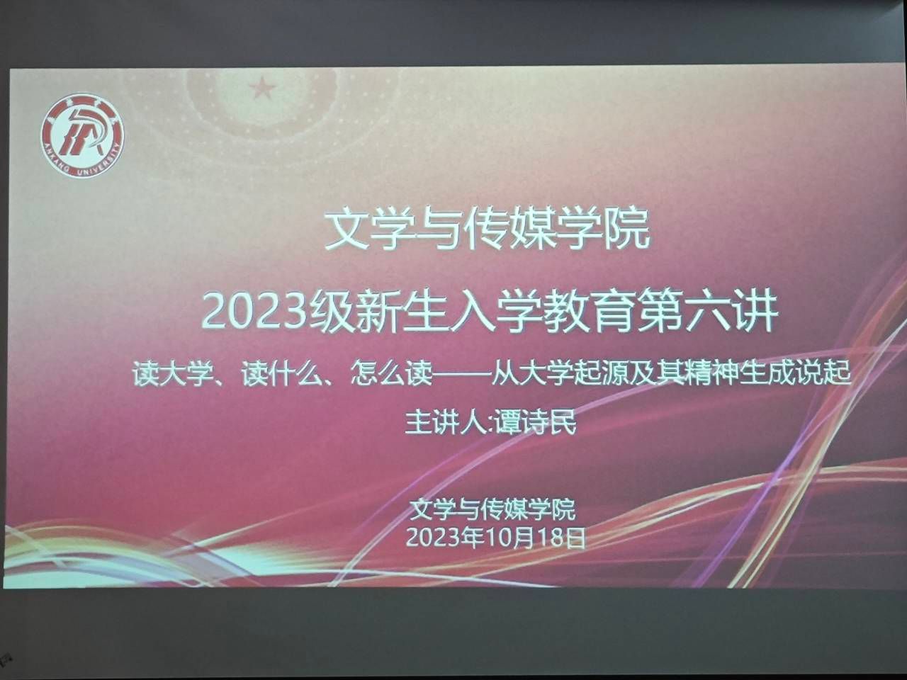 2023年10月18日晚,太阳集团tcy8722于江南校区大礼堂开展了新生入学教育第六讲,邀请太阳集团tcy8722秘书与新媒体系系主任谭诗民博士作了题为“读大学、读什么、怎么读——从大学起源及其精神谈起”的专题讲座。讲座由公司党总支副书记杨海蓉主持,新生辅导员许明、李欣逸组织2023级全体新生到场聆听。