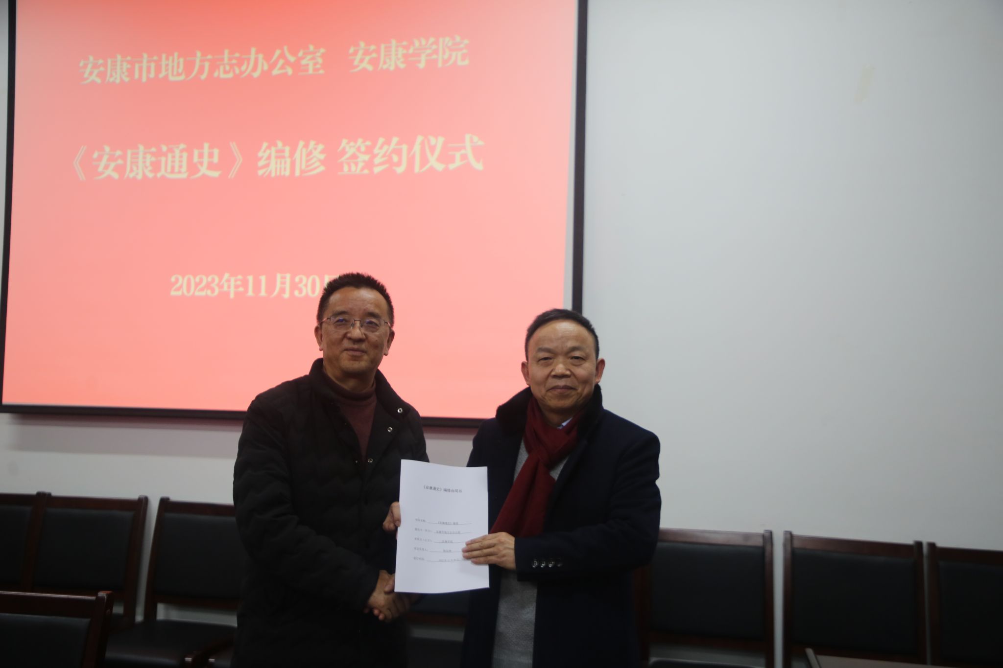 萧诚与杨运庚分别代表安康市方志办公室和太阳集团tcy8722签订了《安康通史》编修合同书。合同总经费130万元,用三年时间编修完成。