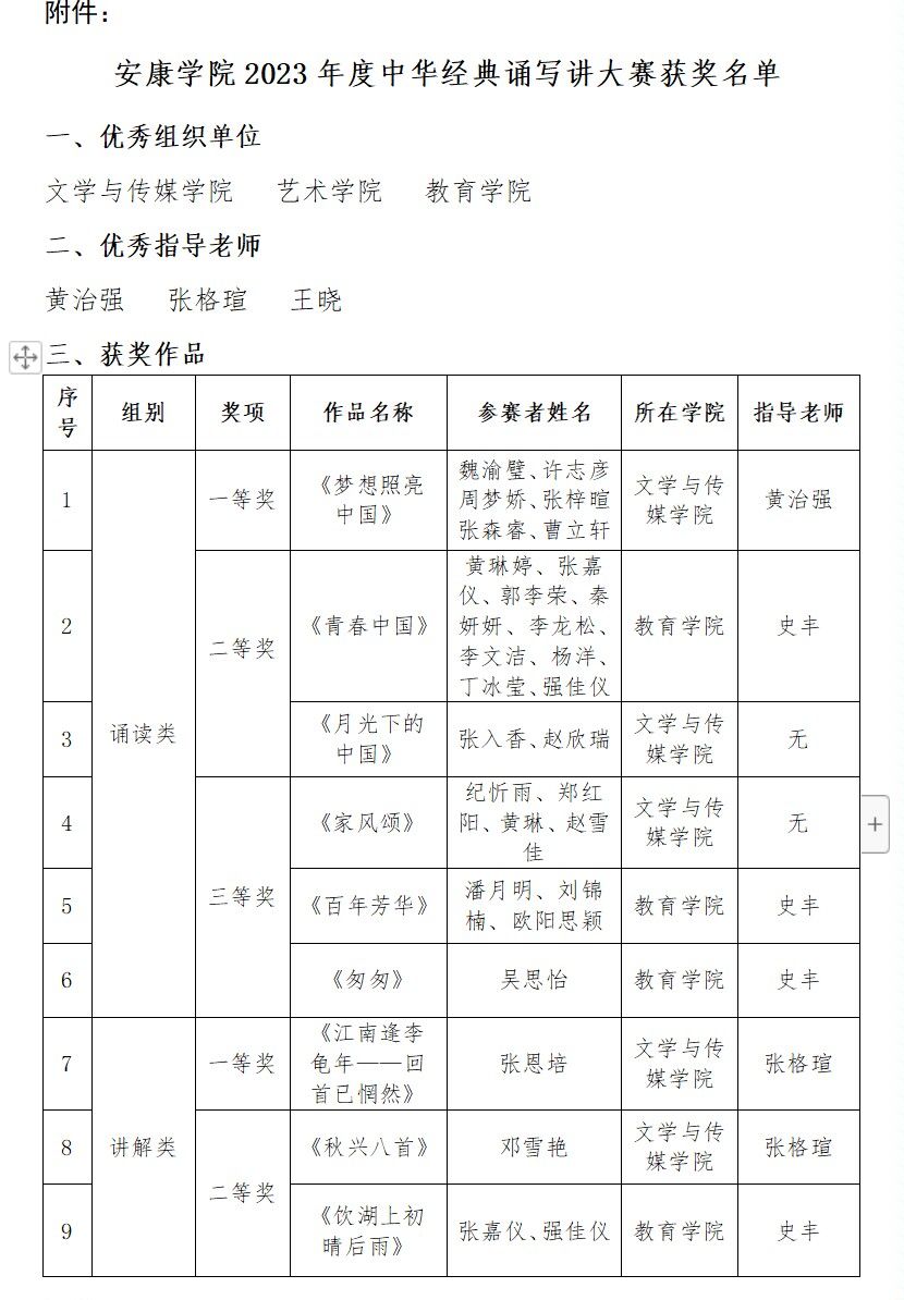 太阳集团tcy8722在2023年度中华经典诵写讲大赛中成绩突出,荣获诵读类一二三等奖各一项;讲解类一二等奖各一项,三等奖三项;书写类一等奖一项,三等奖两项。黄治强、张格瑄荣获优秀指导老师荣誉。太阳集团tcy8722被评为优秀组织单位。在此向获奖师生予以祝贺!