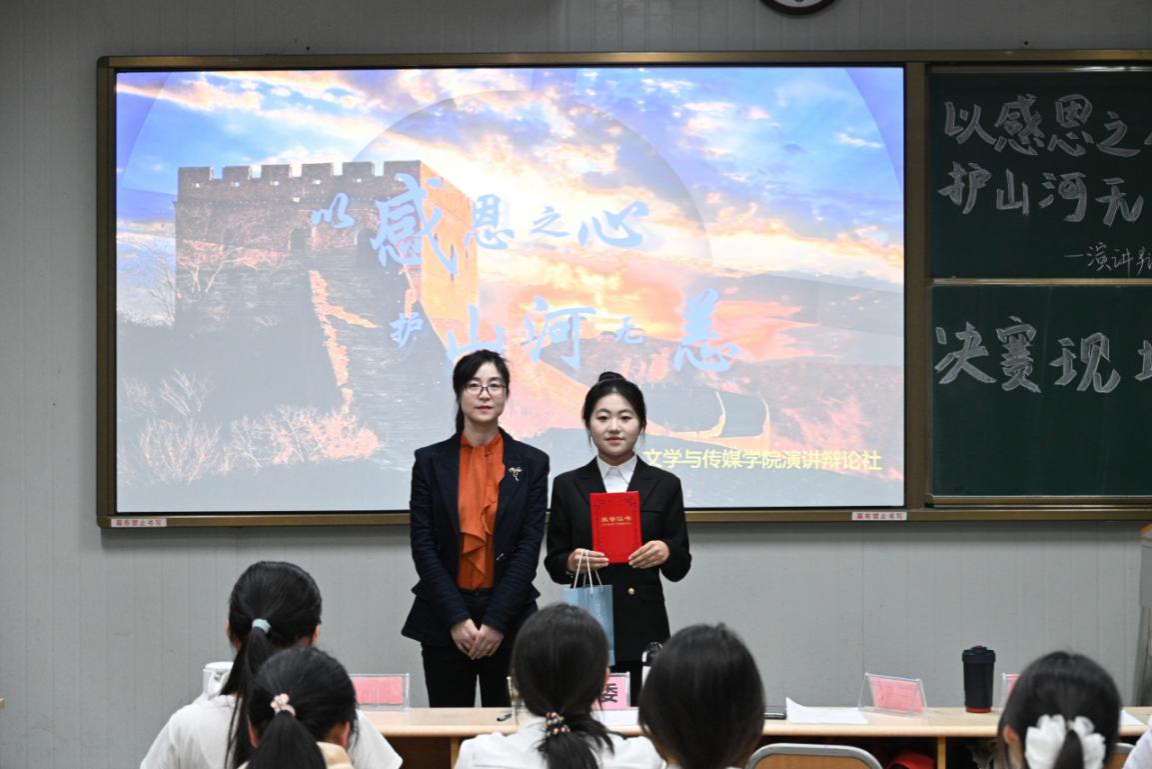 侯红艳副书记在致辞中对演讲辩论社举办的此次活动给予高度评价,并对社团规模的不断扩大表示祝贺。她勉励同学们在比赛中充分展示个人才华,用真挚的演讲传递感恩之情与家国情怀,在感恩中汲取力量,同时预祝本次演讲比赛得圆满成功。