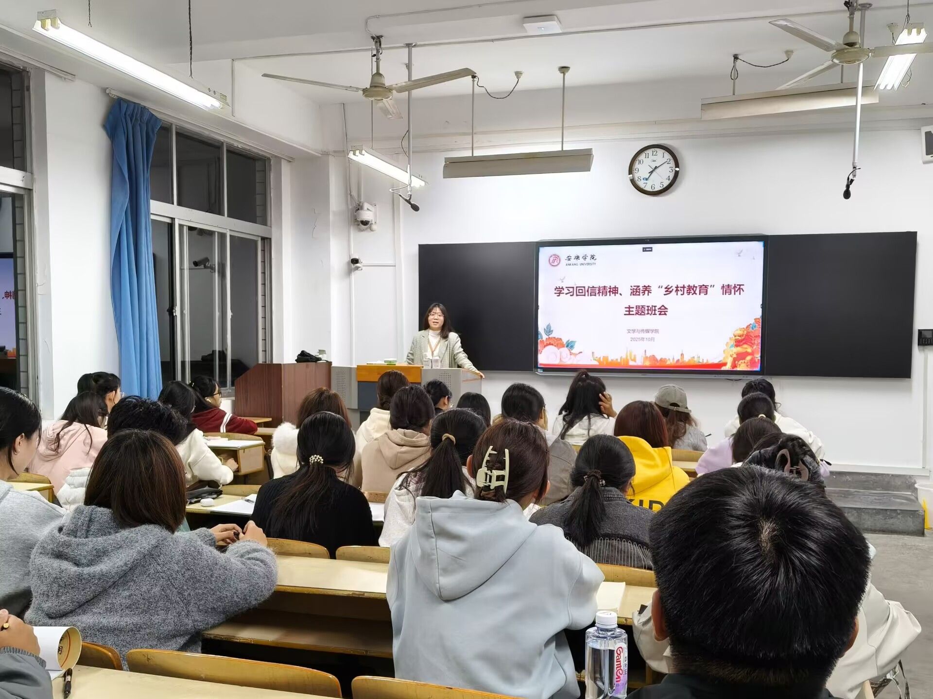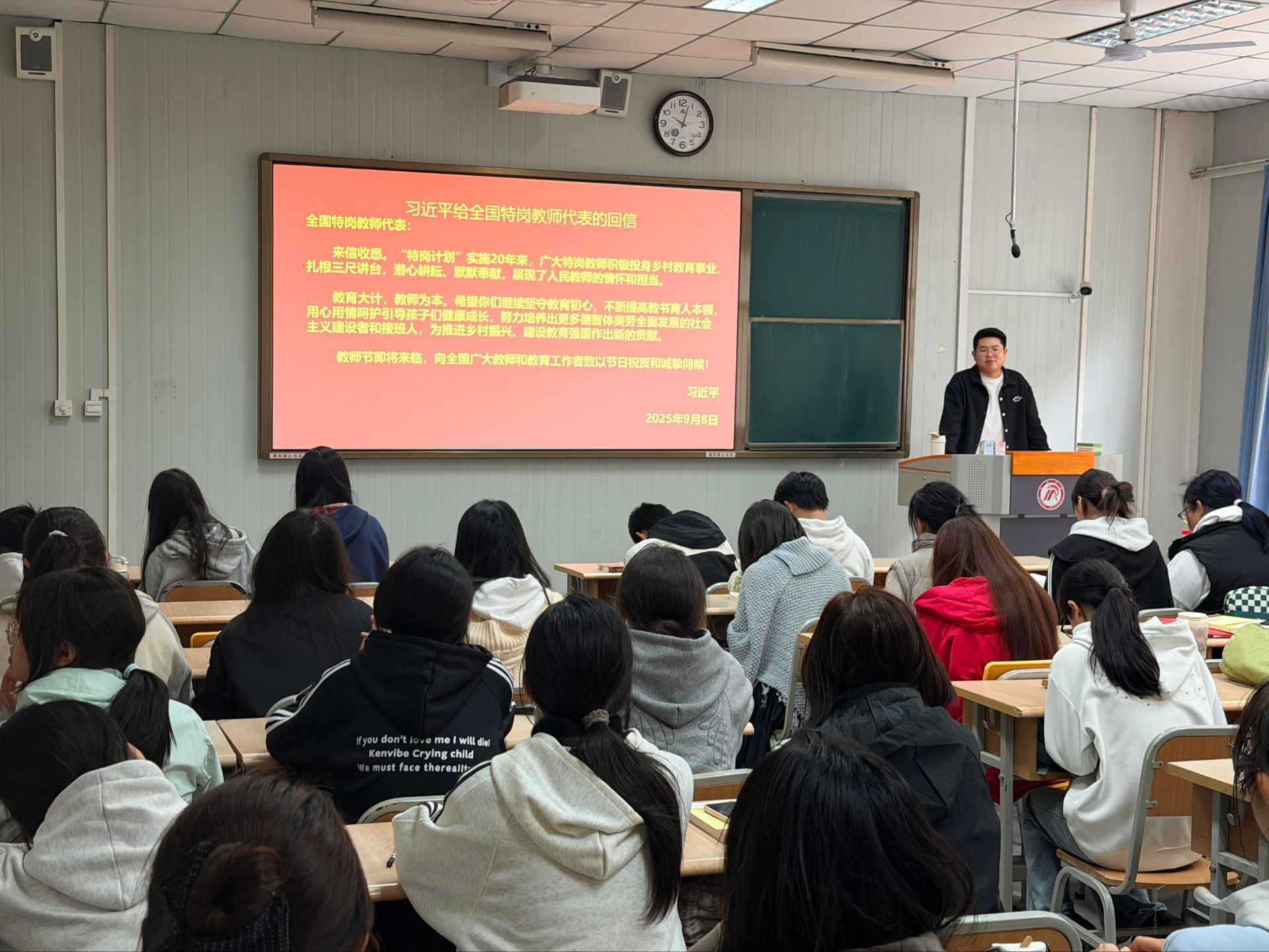 班会紧扣习近平总书记回信的核心要义,系统学习了回信中关于“扎根基层、服务乡村、教书育人”的重要指示精神。同学们通过原文领学、集中研讨、交流发言等形式,深刻领会总书记对广大乡村教师的亲切关怀和对乡村教育事业的高度重视,进一步认识到教育在推进乡村振兴、促进社会公平中的基础性、战略性支撑作用。