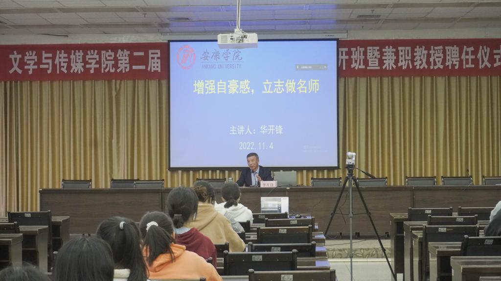 仪式结束后,公司杰出员工、兼职教授华开锋为第二届“中学语文卓越团队班”“增强自豪感,立志做名师”的首场学术报告。