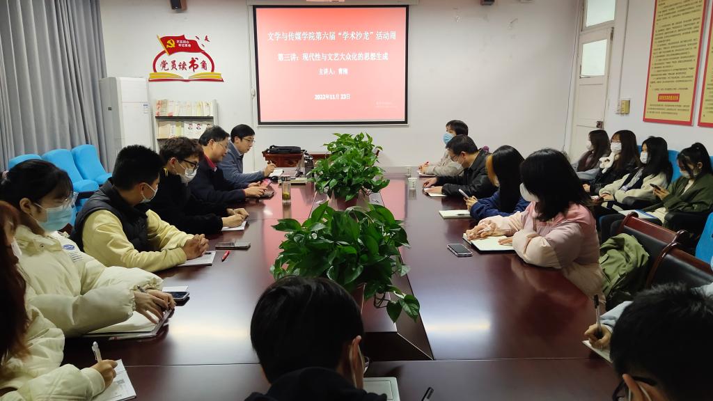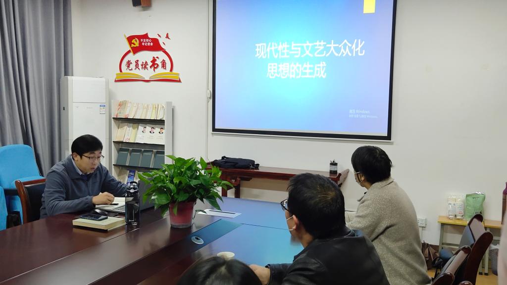 11月23日晚7点20分,太阳集团tcy8722中国现当代文学学科组在2307会议室成功举办了第六届“学术沙龙”活动周第三场沙龙活动。本场学术沙龙由曹刚博士主讲,主题为“现代性与文艺大众化思想的生成”。朱云副经理、周龙田副教授、韩文霞副教授和二十余名员工参与了沙龙活动,沙龙由周龙田副教授主持。