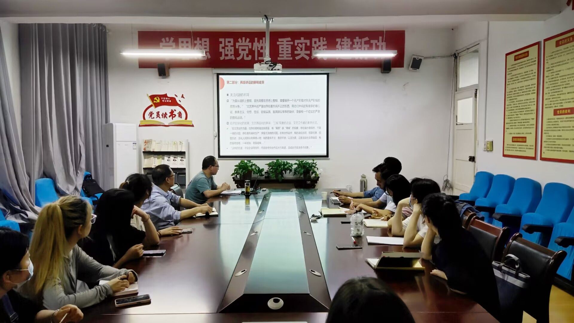 谭诗民博士在主题报告中从研究现状与问题提出、两版讲话的差异、两版讲话的继承创新和两版讲话的当代启示四个方面做了汇报。他谈到,两版讲话是中国共产党人在文艺观念上的集体意识与集体表象,体现了中国共产党人对文艺性质和意义的理解与认知。二者在生成逻辑、关注问题和话语体系上有较为明显的差异。而强调文艺的人民性,不断地丰富人民性的内涵;肯定文艺的政治性,不断地延展政治性的空间;构筑文化的领导权,不断地优化领导权的实现途径又体现了二者的继承与创新。随后,全体与会教师立足个人研究方向,对讲座内容从多个角度进行了讨论和点评。