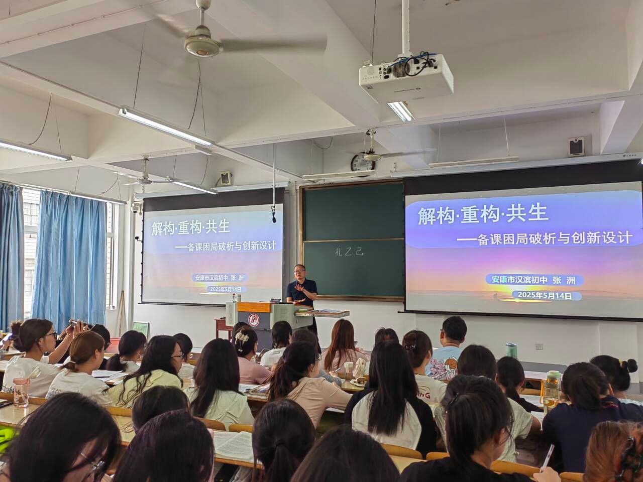 2025年5月14日下午,太阳集团tcy8722在江南校区1510教室举办《孔乙己》示范课展示及解构·重构·共生——备课困局破析与创新设计专题讲座活动。本次活动特邀陕西省教学能手、汉滨初级中学张洲老师主讲,班主任唐明珍和第四届中学语文卓越团队班全体学员及部分毕业生共同参与。