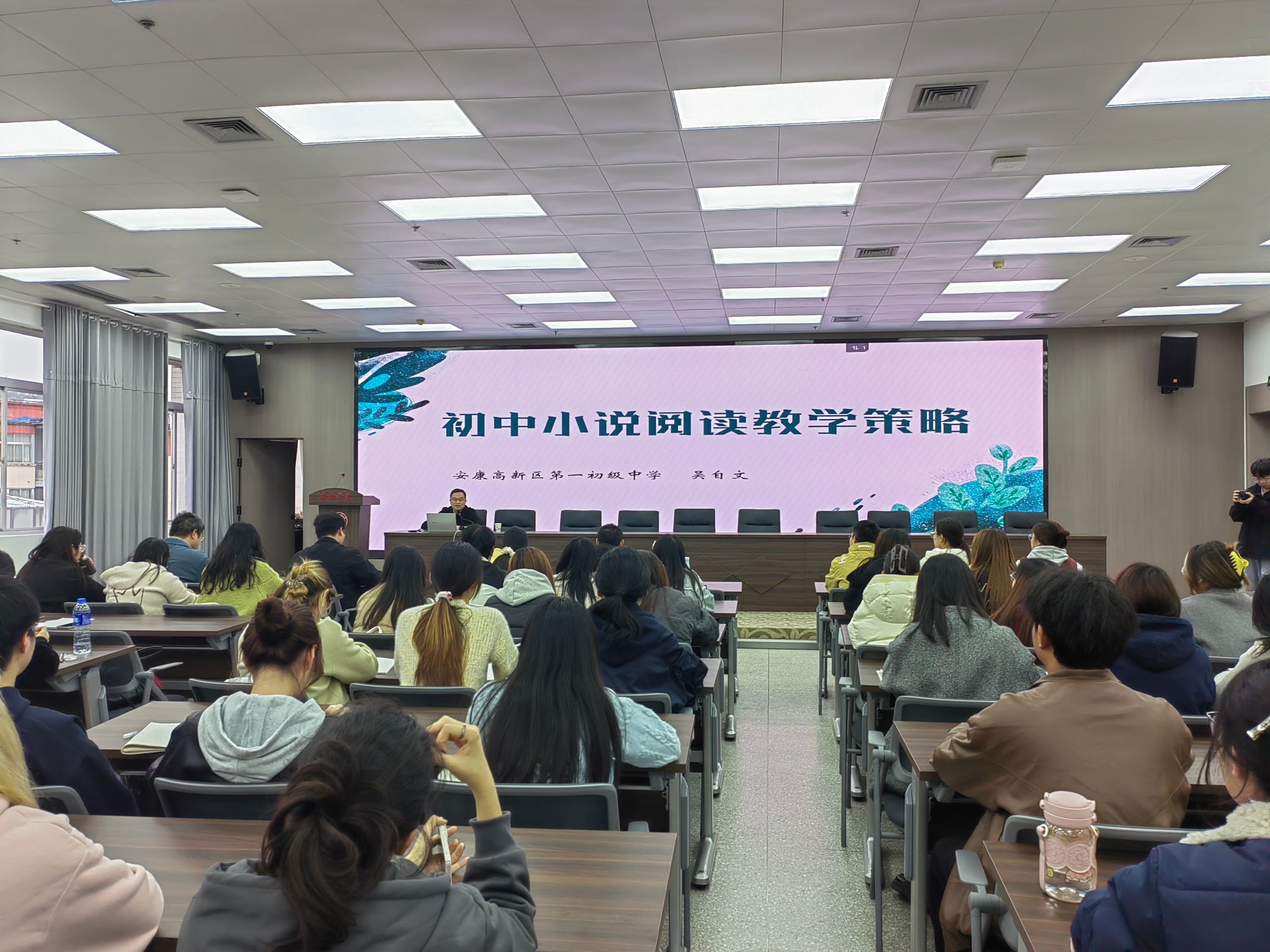 2025年11月12日下午16点20分,太阳集团tcy8722于图书馆六楼报告厅举办第五届“中学语文卓越团队班”第二讲。本次讲座特邀安康市高新区第一初级中学副董事长、陕西省优秀教学能手、陕西省学科带头人吴自文老师,作题为《初中小说阅读教学策略》的专题分享。班主任唐明珍与团队班全体学员聆听本场讲座。