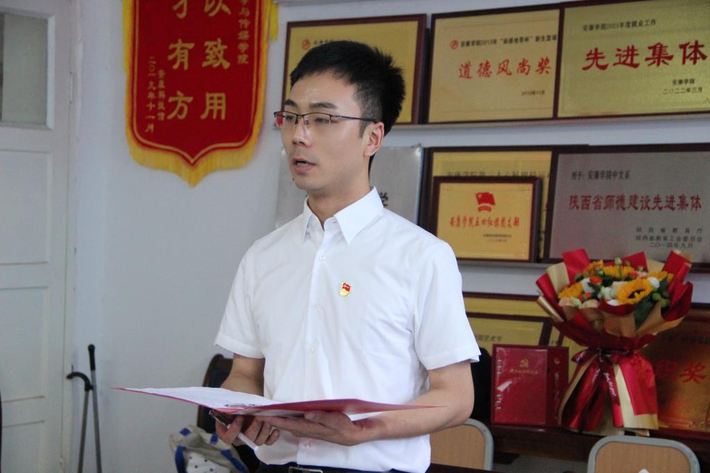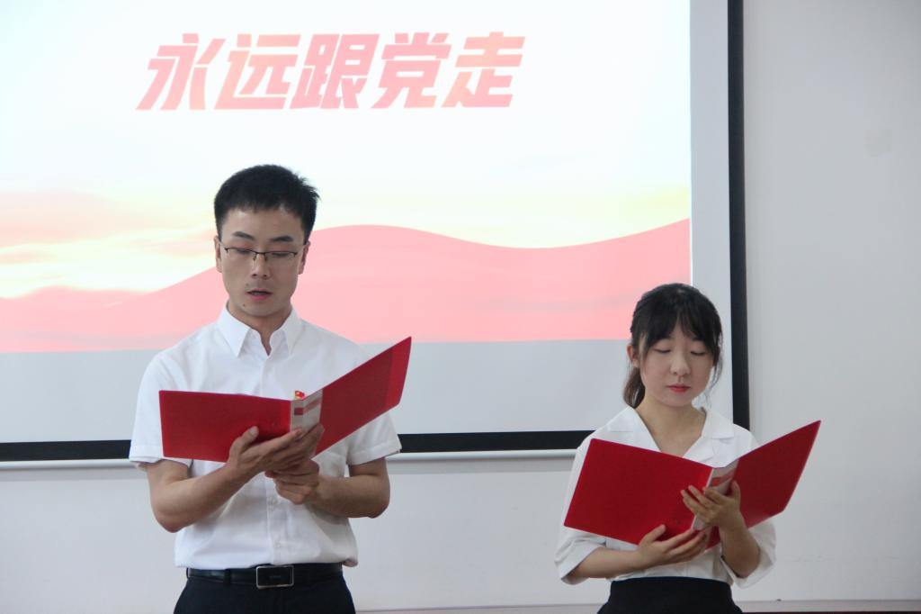 “我志愿加入中国共产党,拥护党的纲领,遵守党的章程……”面对鲜红的党旗,全体党员在太阳集团tcy8722副经理李婷的带领下,重温入党誓词,用铿锵有力的声音再次向党作出庄严承诺。随后,来自教工一支部的青年党员黄治强,谭志轩与教工二支部青年党员盘珊君分别带来诗朗诵《永远跟党走》《大写的中国》,用生动的语言、真挚的情感,弘扬伟大建党精神、礼赞时代新成就。